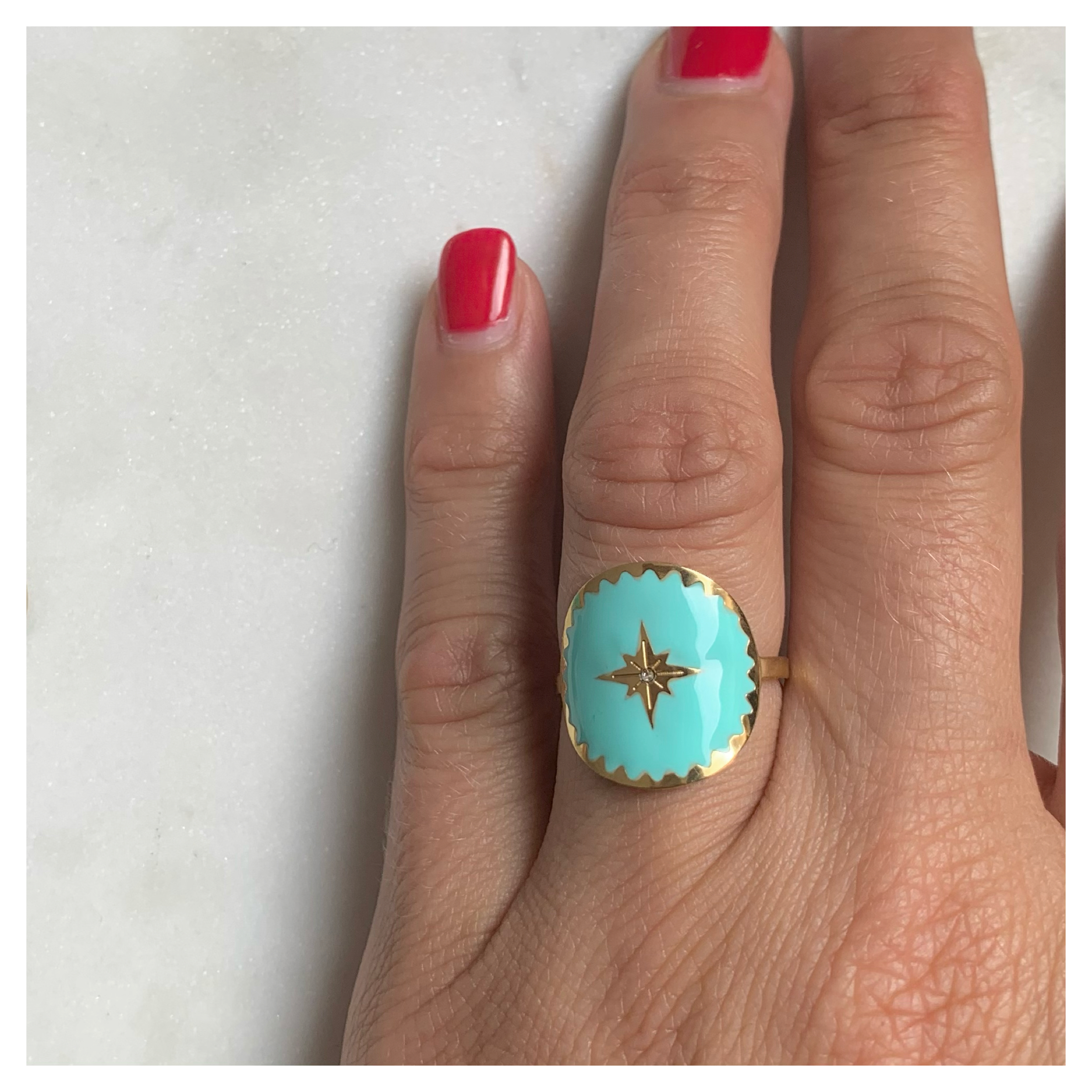 Cette bague est fabriquée en acier inoxydable doré émaillé. Nous vous proposons quatre couleur différentes. Vous trouverez en son centre une jolie rose des vents, sublimée par un petit strass.