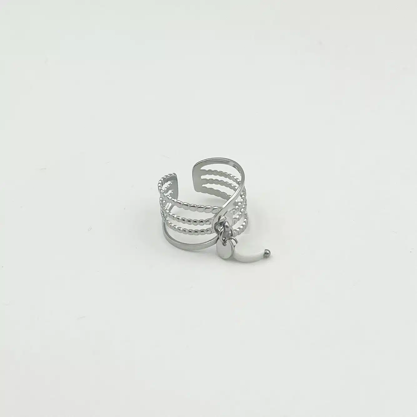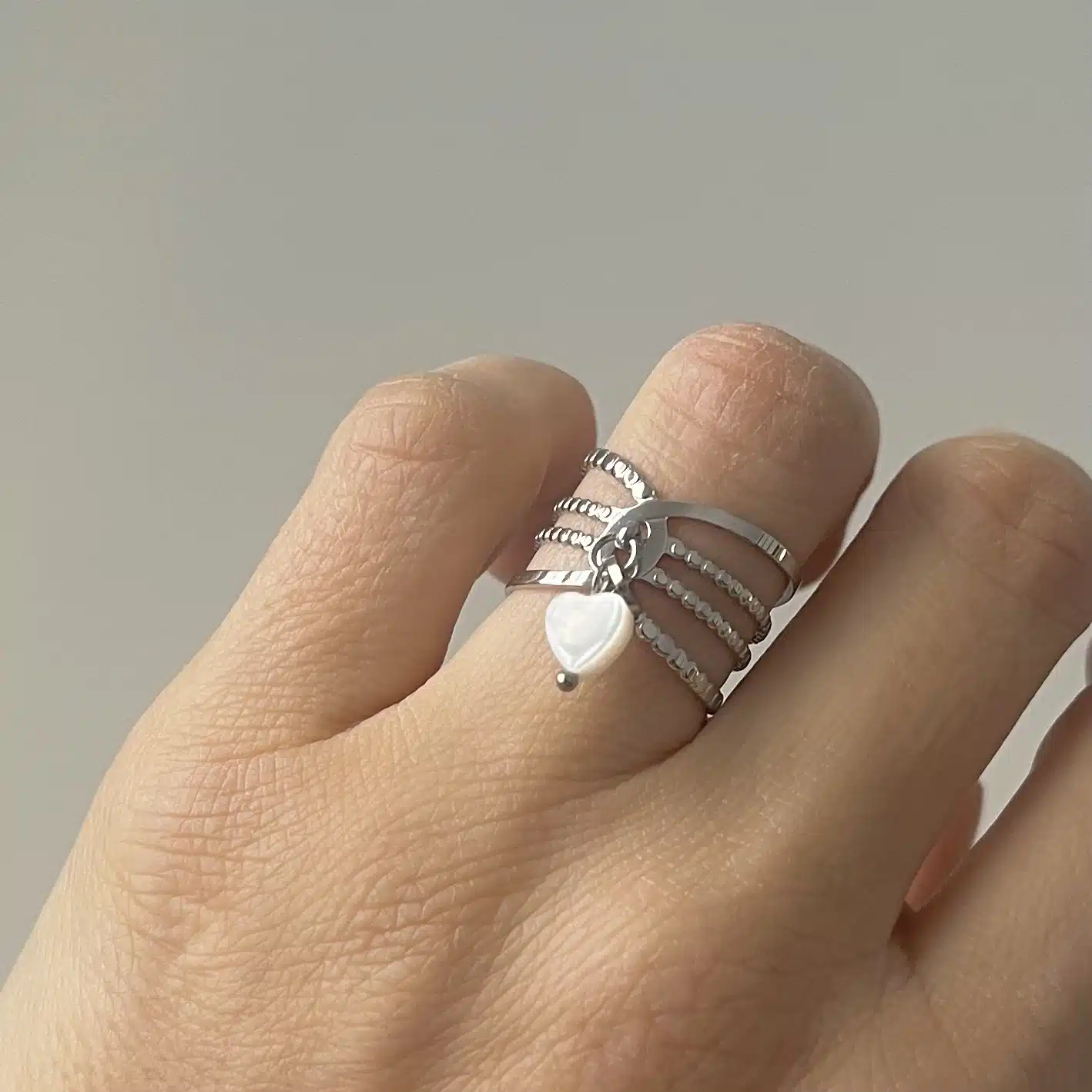 • Joli bijou large sur le doigt composé de plusieurs anneaux travaillés et de deux pampilles. Une pampille ronde et l’autre en pierre naturelle de nacre blanche ou grise en forme de coeur