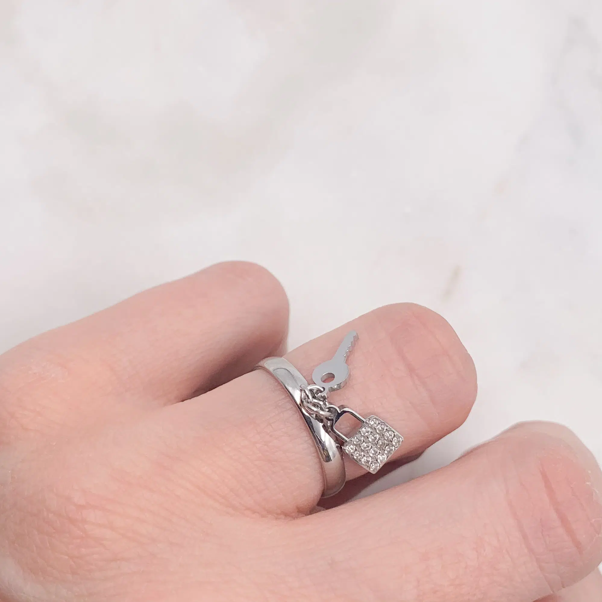 - Joli bijou doté de deux petites pampilles, l’une en forme de cadenas avec petits strass blancs incrustés, la seconde en forme de clé
