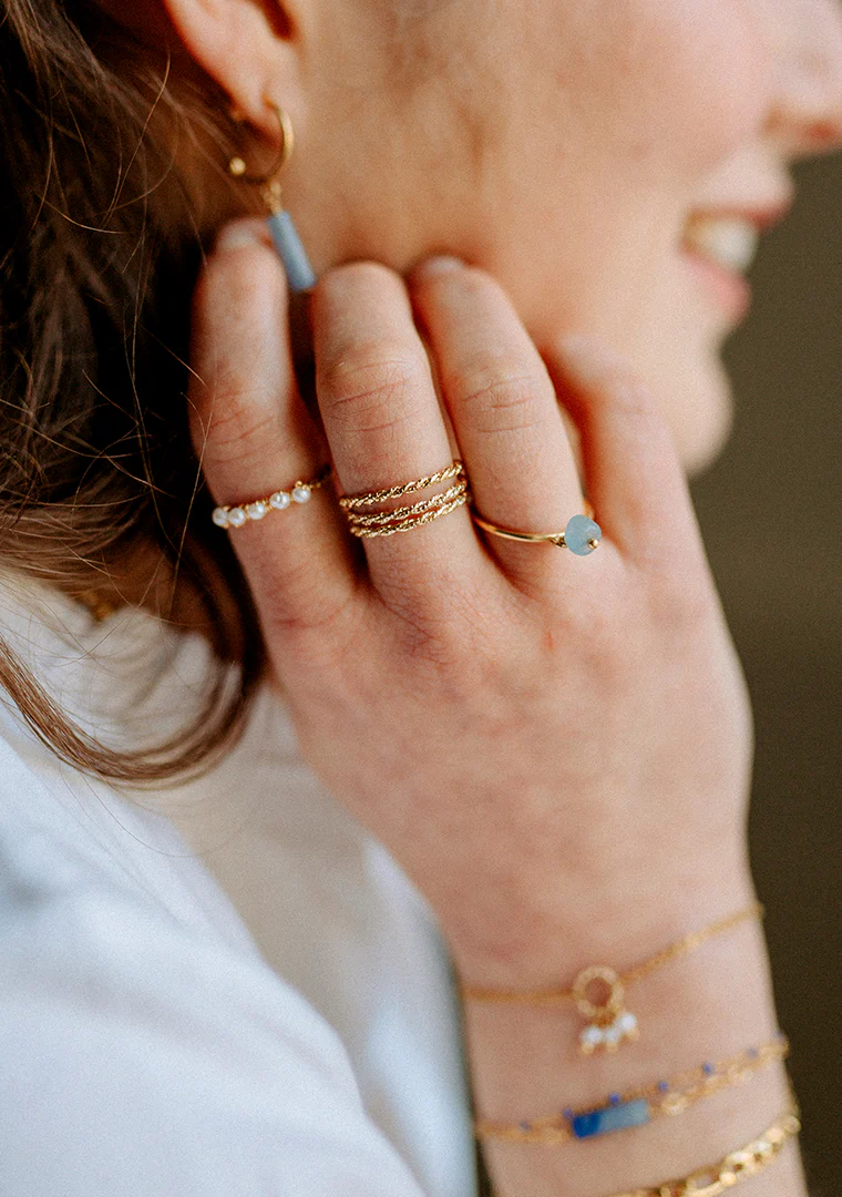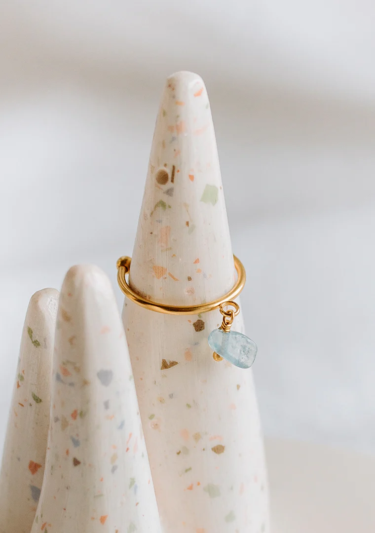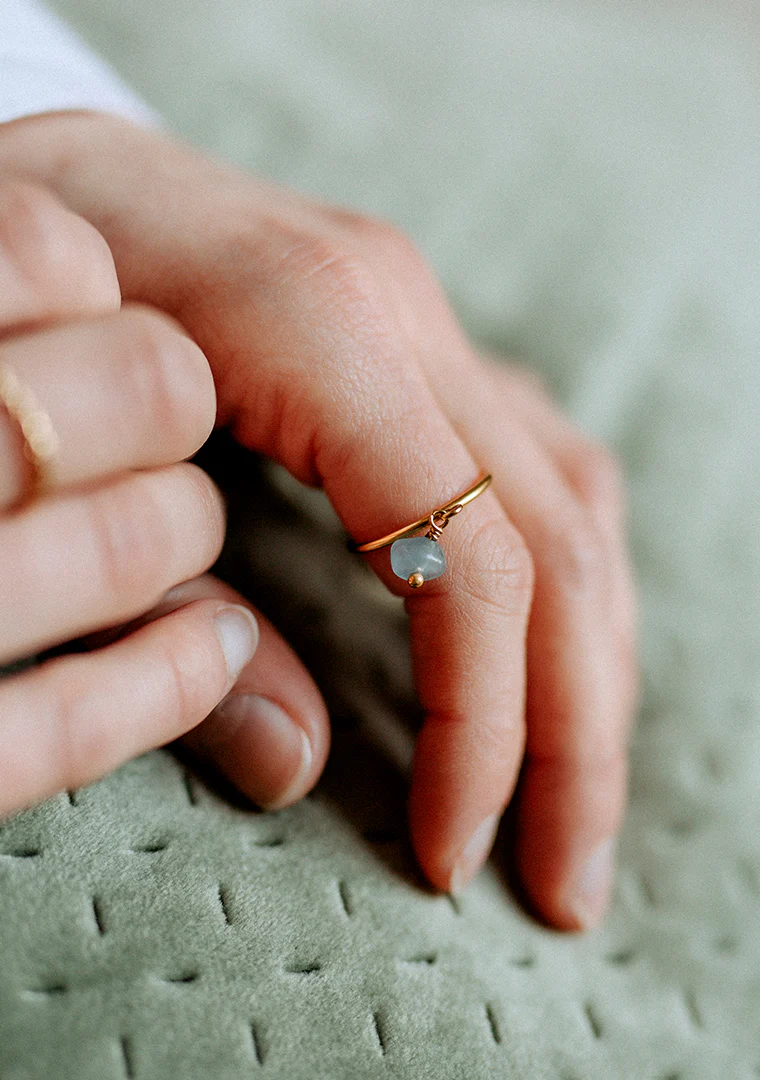 La bague réglable Emy est fabriquée à la main dans mon atelier, Elle est ornée d’une pampille en Aigue-Marine,