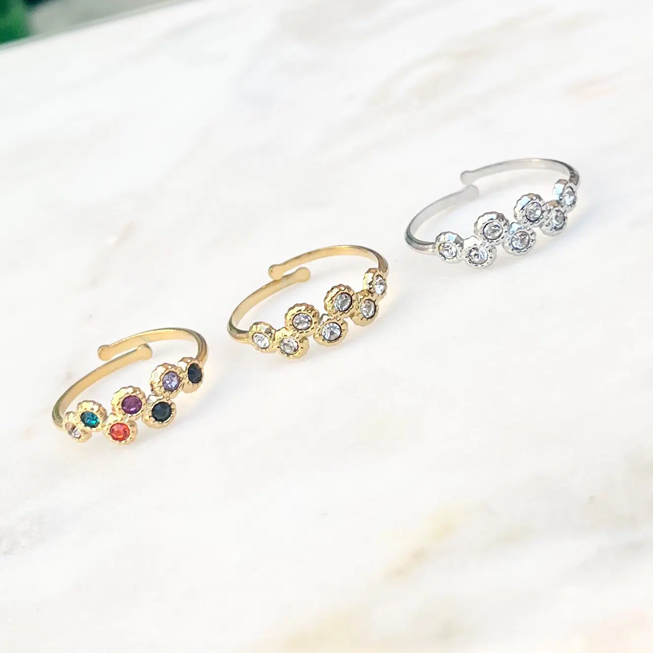 - On est fan de ce petit bijou composé d’un anneau fin et de sept petits strass de couleur blanche ou multicolore