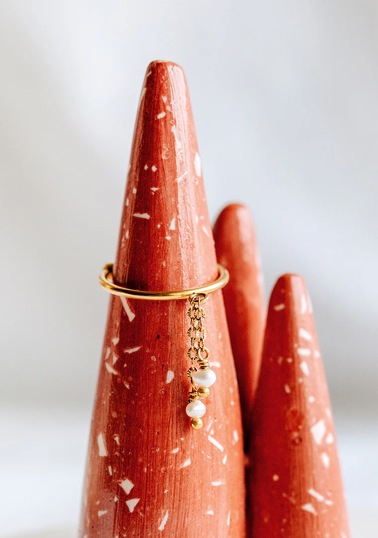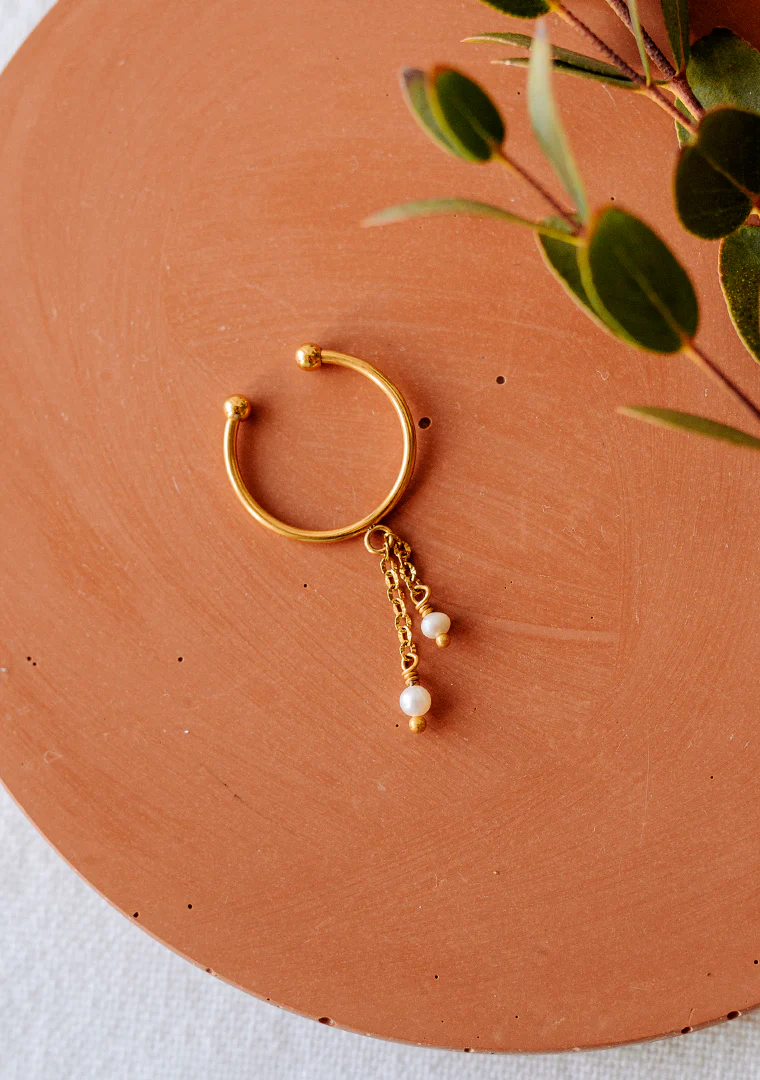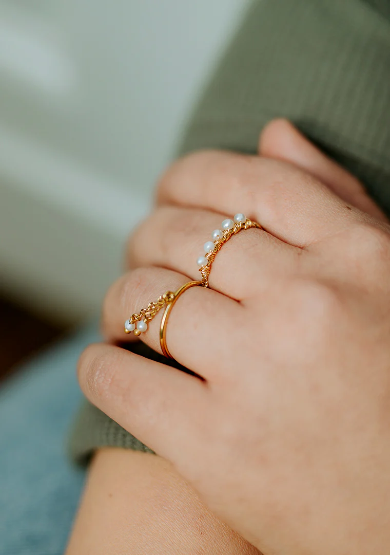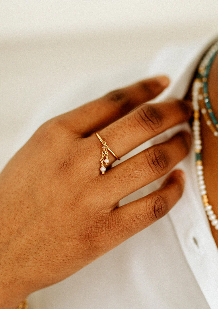 La bague réglable Joy est fabriquée à la main dans mon atelier, Elle est habillée de chaines aux maillons striées toutes deux ornées de perles d’eau douce,