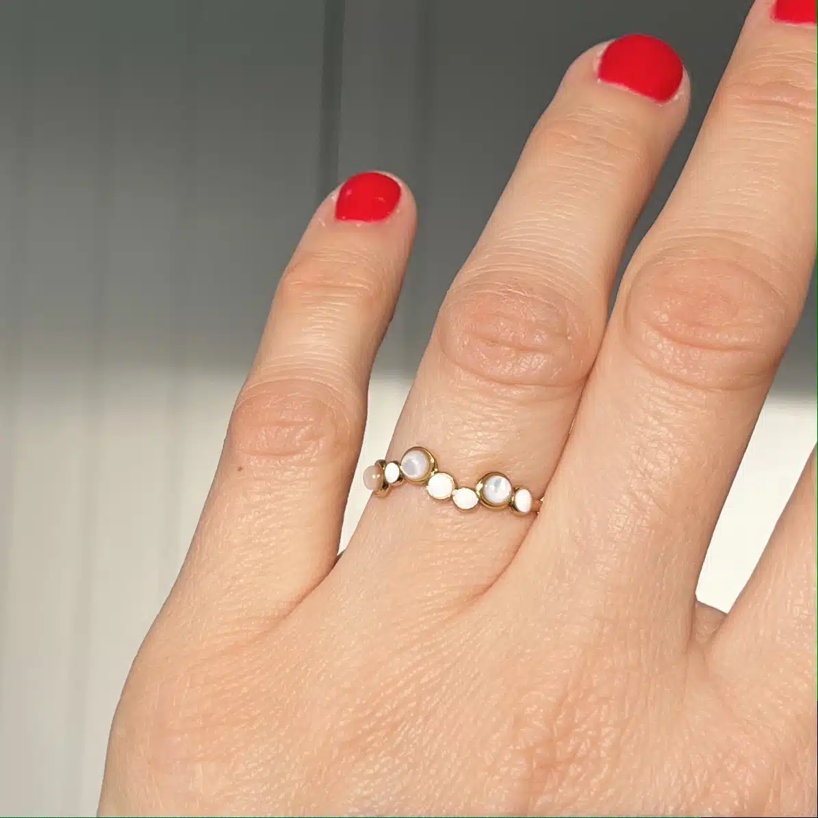 - Bague fine en acier inoxydable fine sur le doigt, composée de petites pierres naturelles de nacre de forme ronde