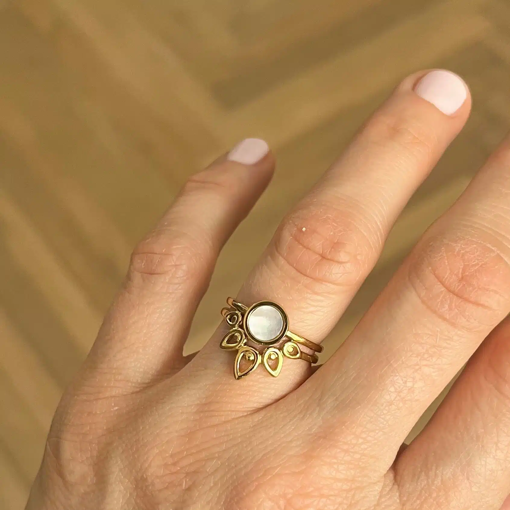 - Ce bijou est d’un double anneau et d’une finition en forme de couronne, de fleur, sertie d’une pierre de nacre naturelle