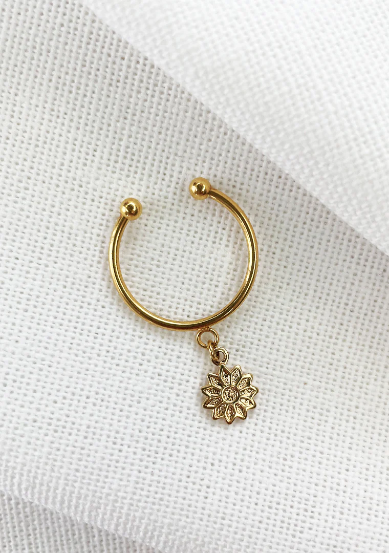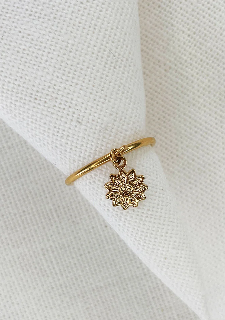 La bague réglable Marguerite est fabriquée à la main dans mon atelier, Elle est habillée d’une pampille ornée d’une petite fleur dorée,
