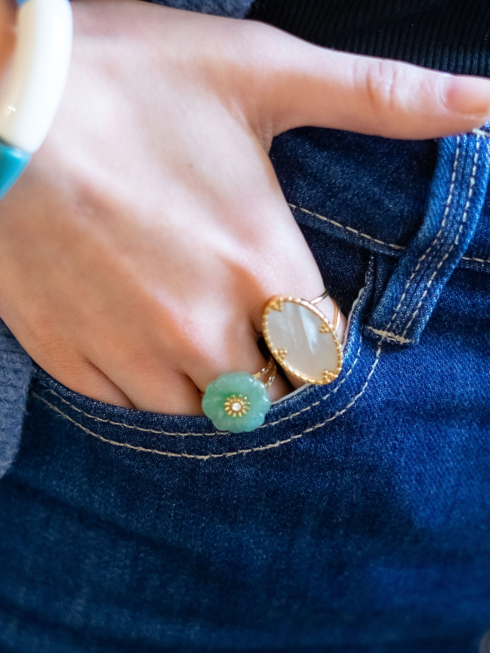 La bague réglable Mél fait partie des quelques bijoux que je ne fabrique pas à l’atelier, Elle est fabriquée par un fournisseur sous-traitant de SIKA, sélectionné pour ces prestations de qualité, Elle est décorée d’une grande Nacre ovale,