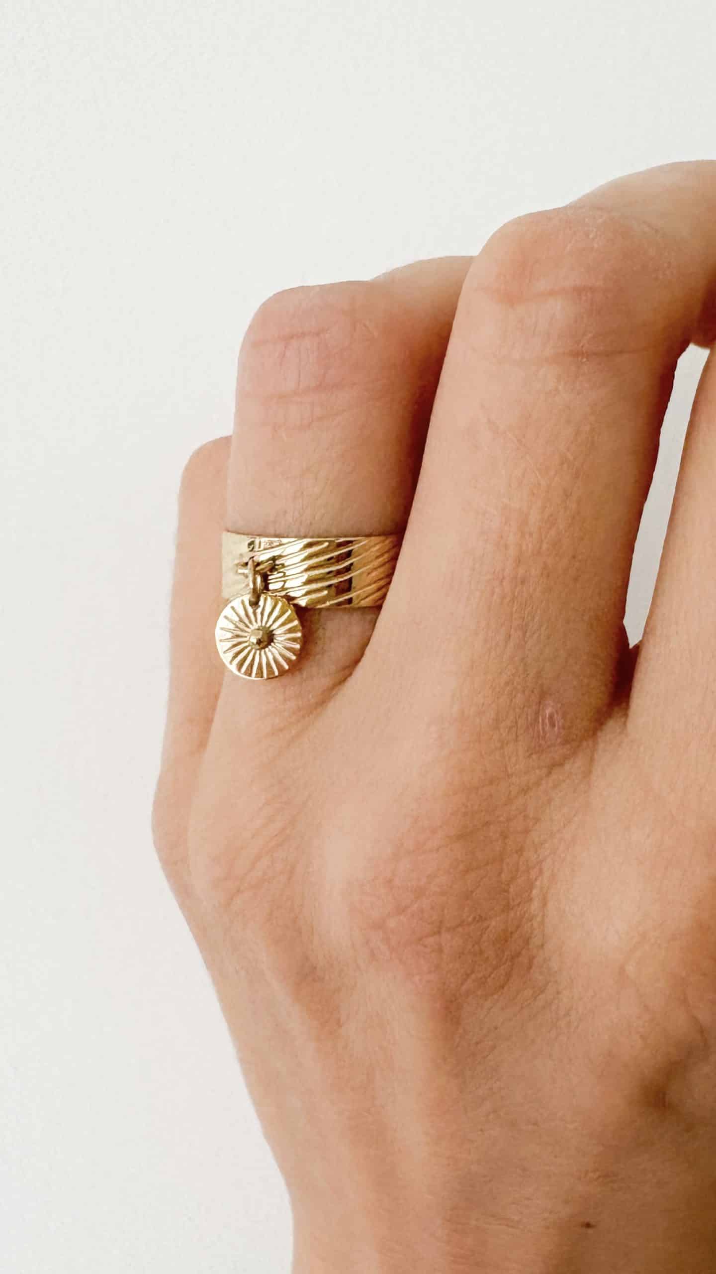 • Composée d’un anneau travaillé et ciselé et d’une breloque ronde comme un soleil