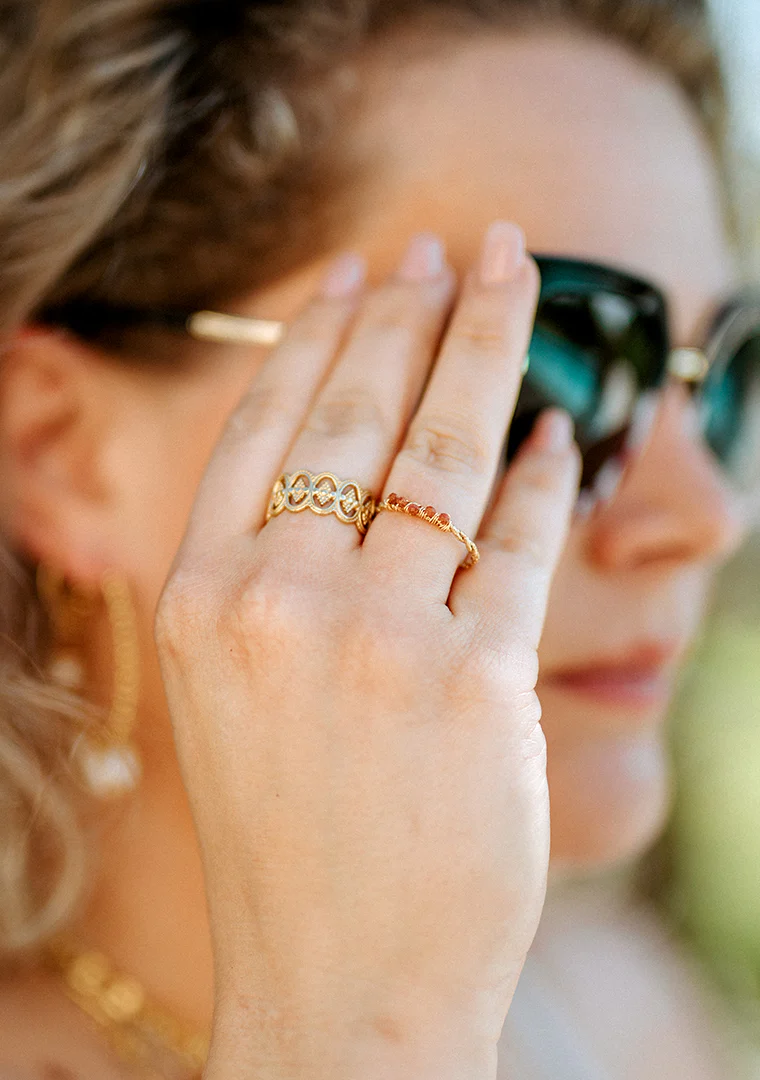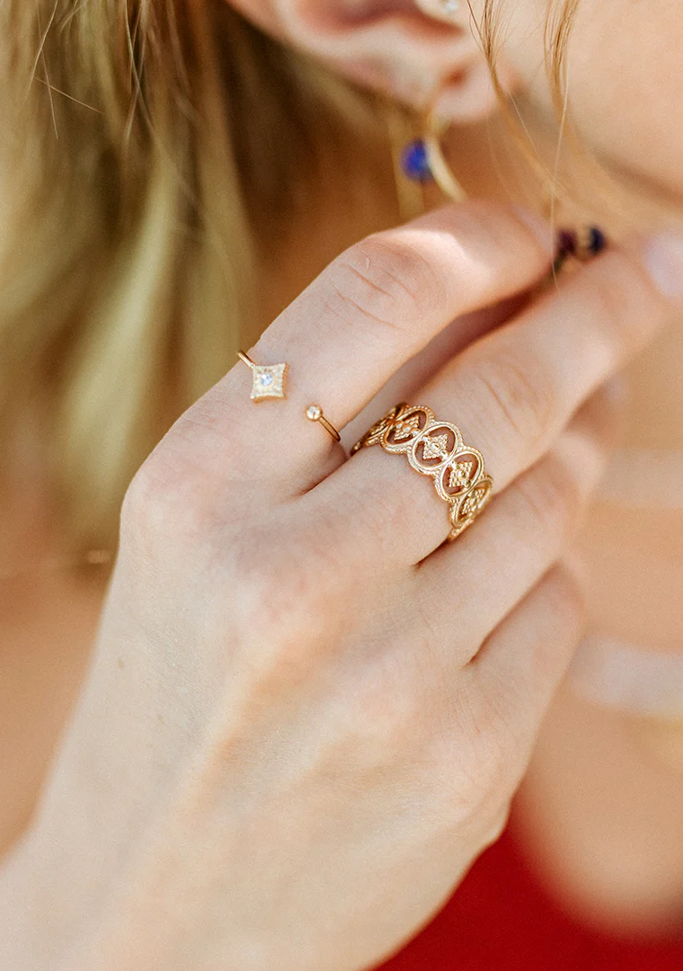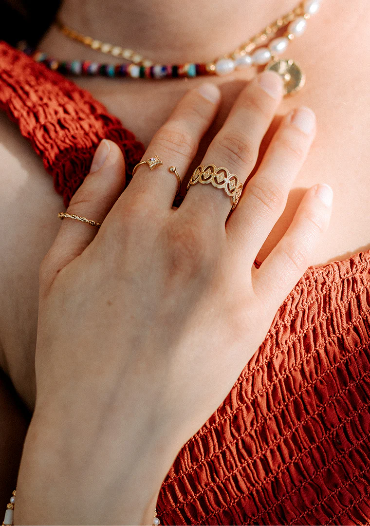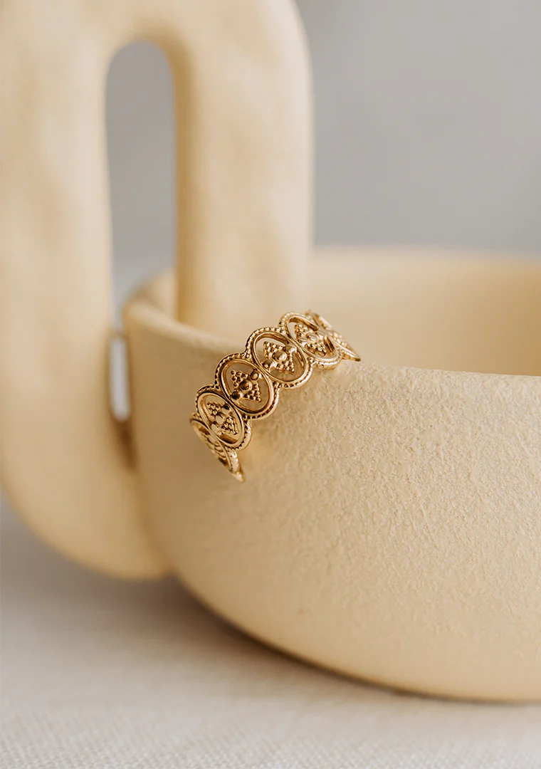 La bague réglable Sienna n’est pas fabriquée dans mon atelier, mais par un fournisseur sous-traitant de SIKA, sélectionné pour ces prestations de qualité, Elle est décorée de motifs graphiques texturés et ajourés,