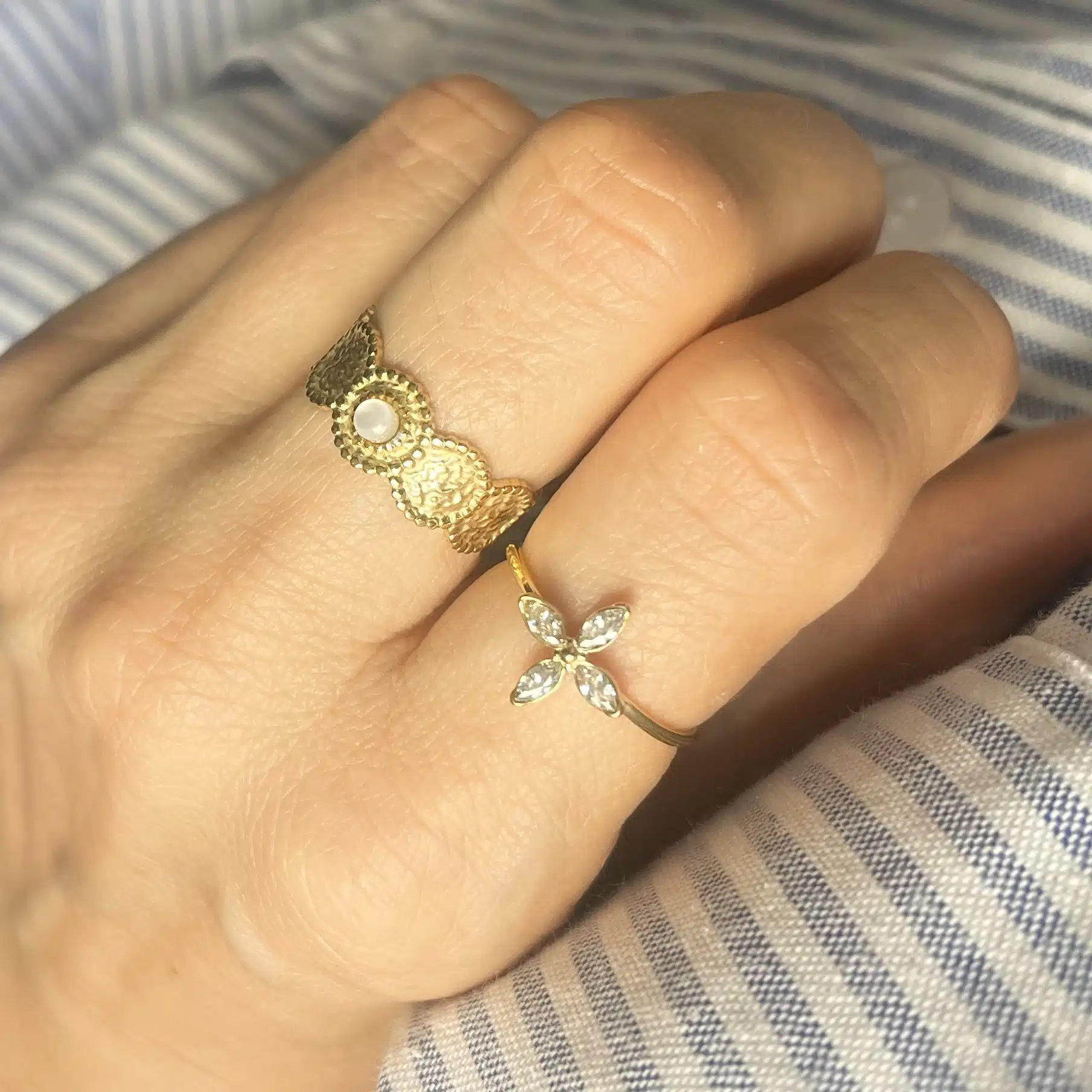 - Ce bijou est composé d’un très fin anneau ajustable et, en son centre, d’un petit trèfle (ou petite fleur) composé de quatre jolis strass blancs