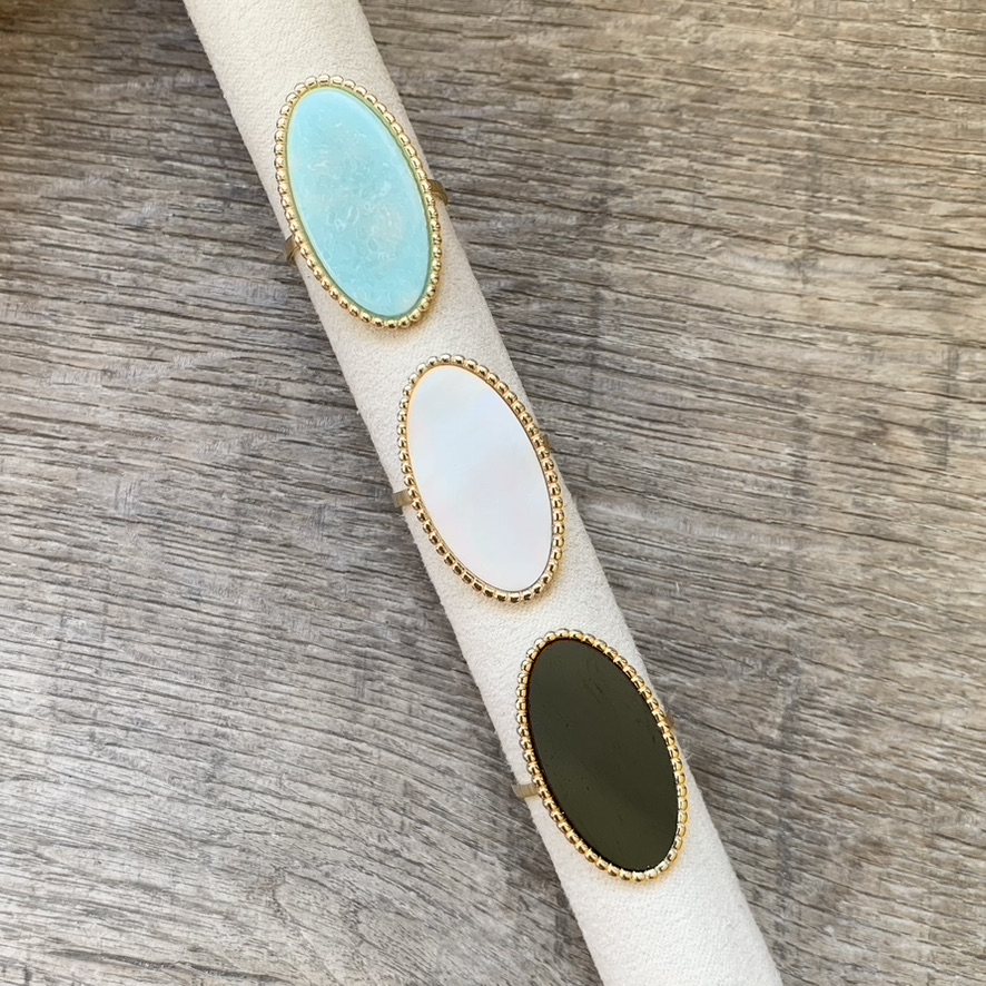 Jolie bague ovale composée d’une pierre de couleur nacre, turquoise ou noir.