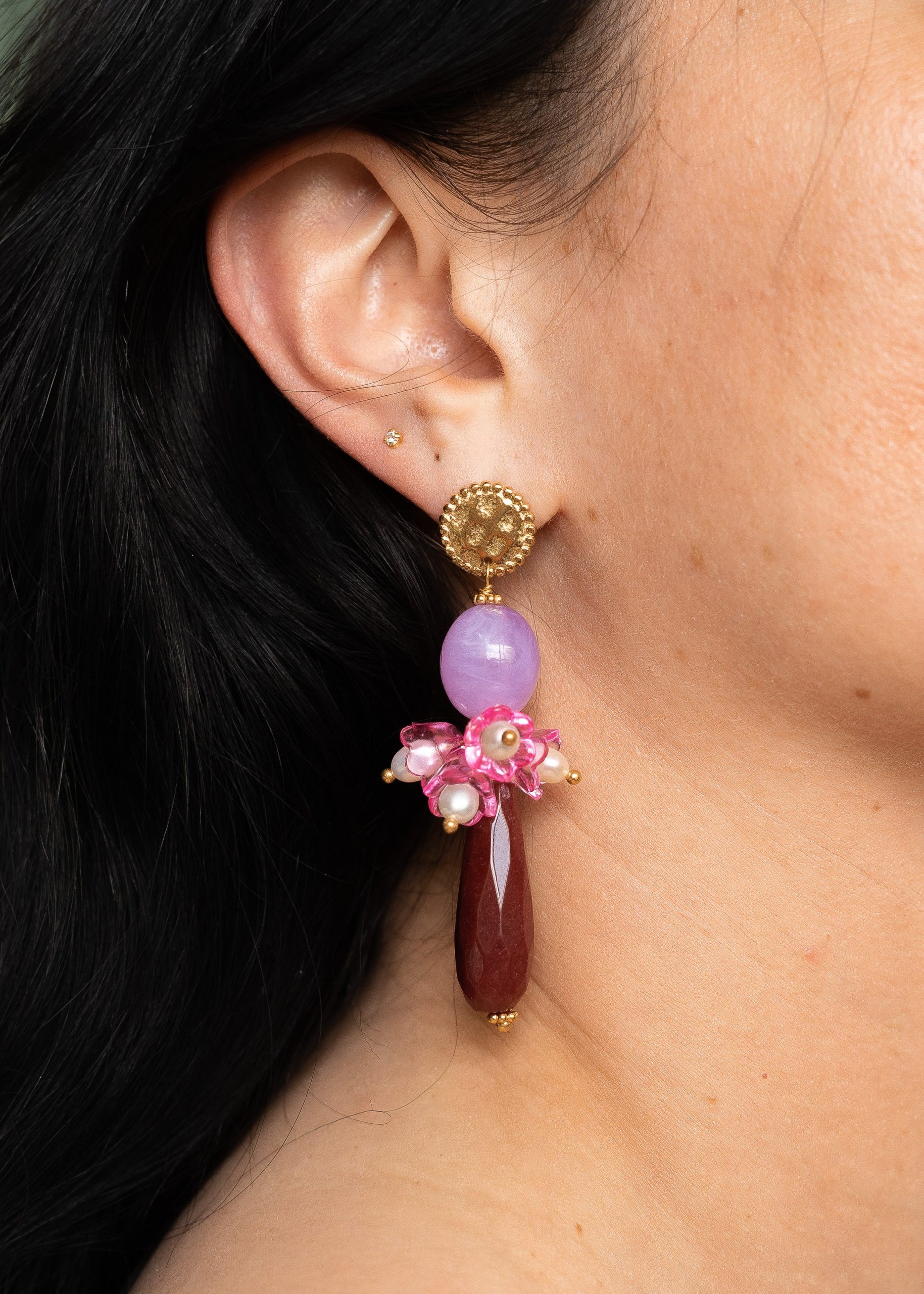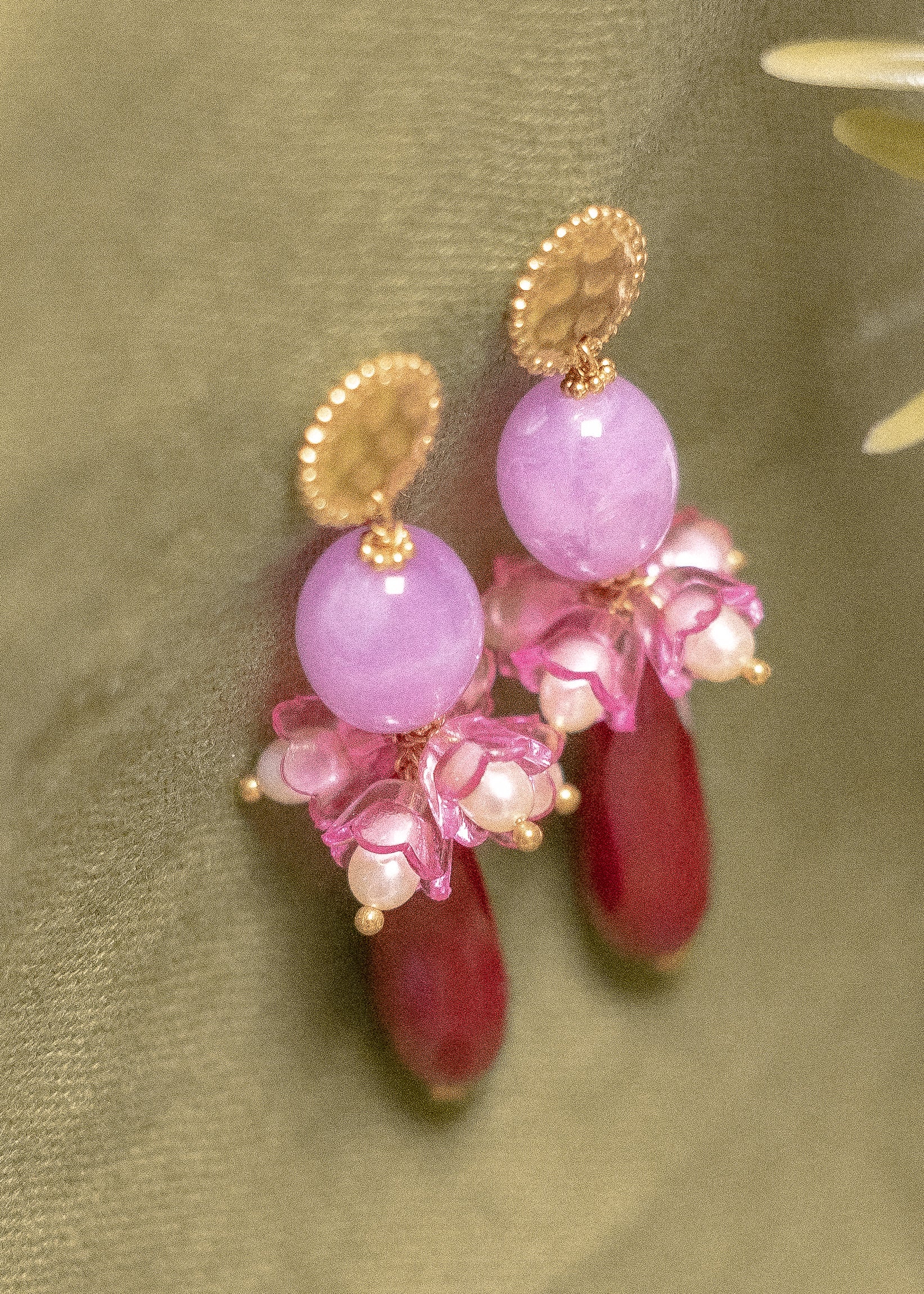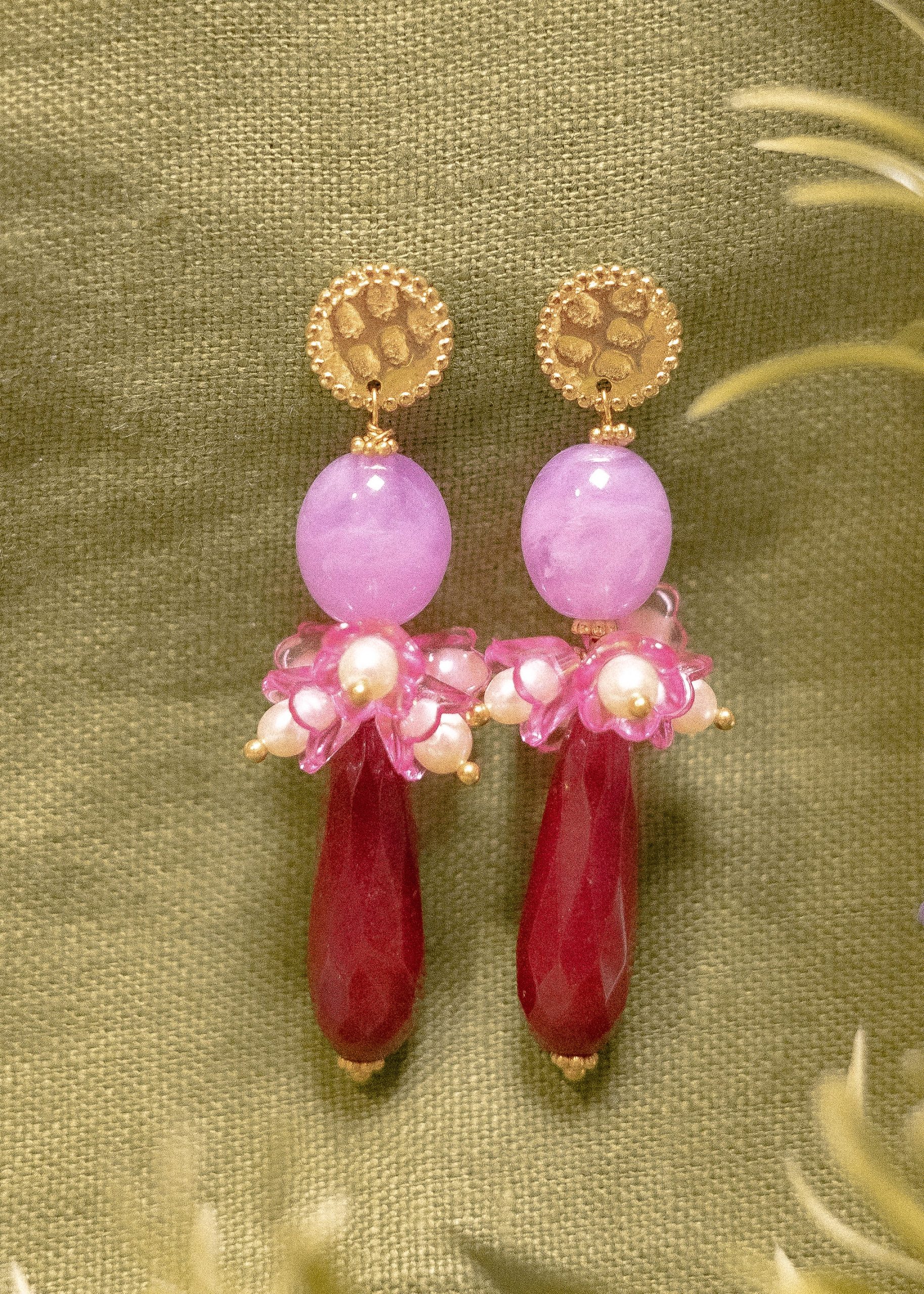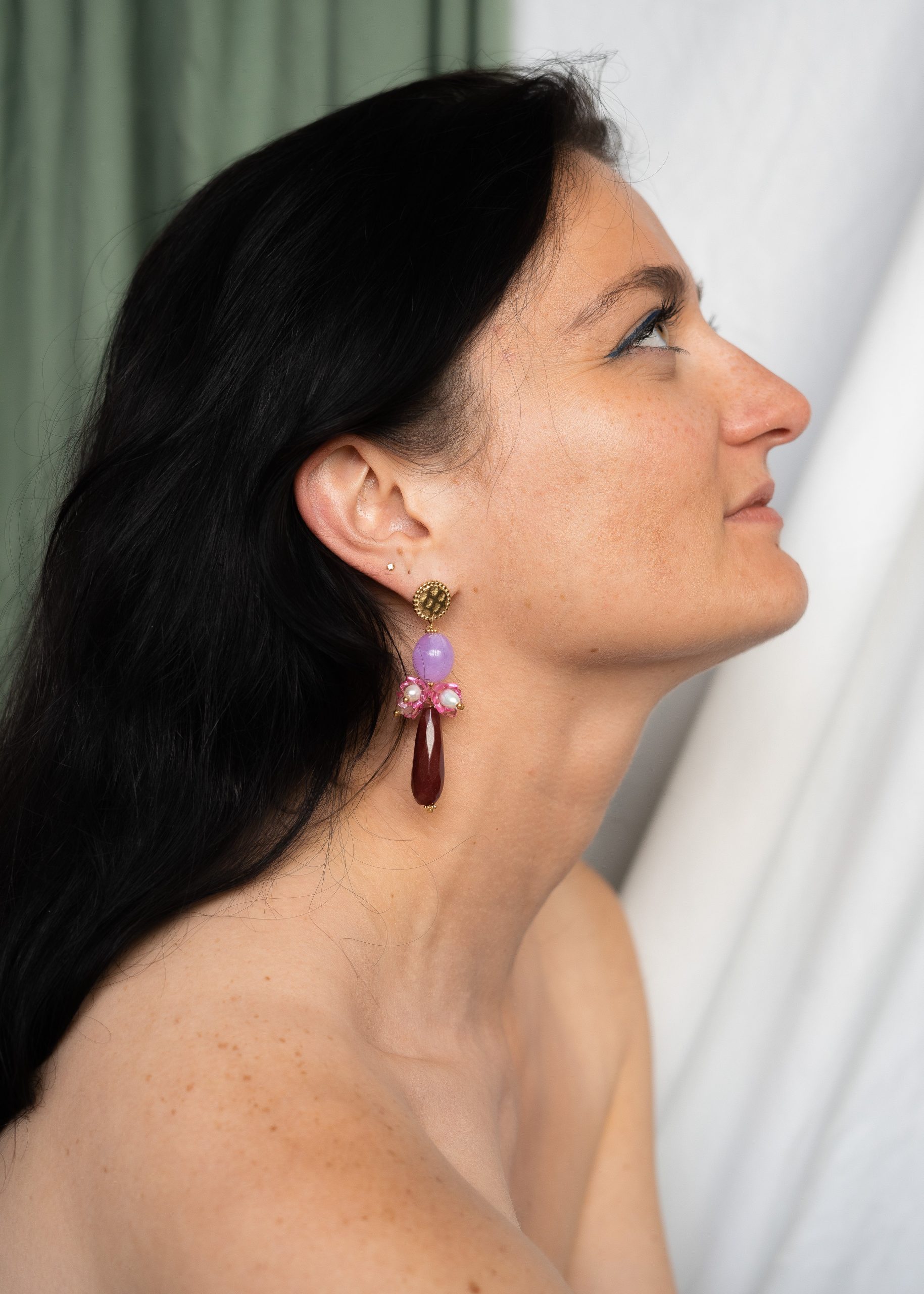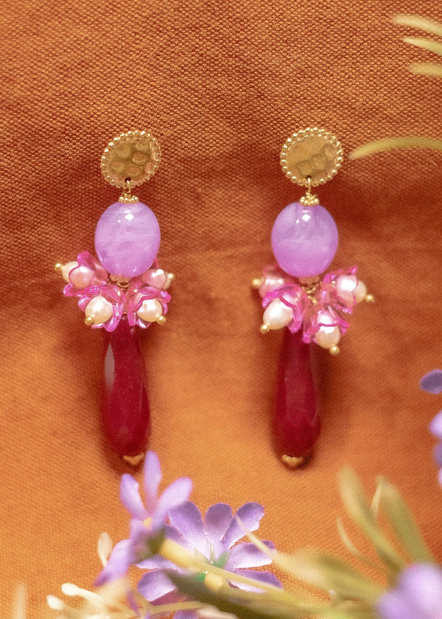 Les boucles Azalée sont fabriquées à la main dans mon atelier, Elles sont composées d’une puce martelée, sur laquelle sont montées des perles en résines, en jade, ainsi qu’une multitude de perles d’eau douce,