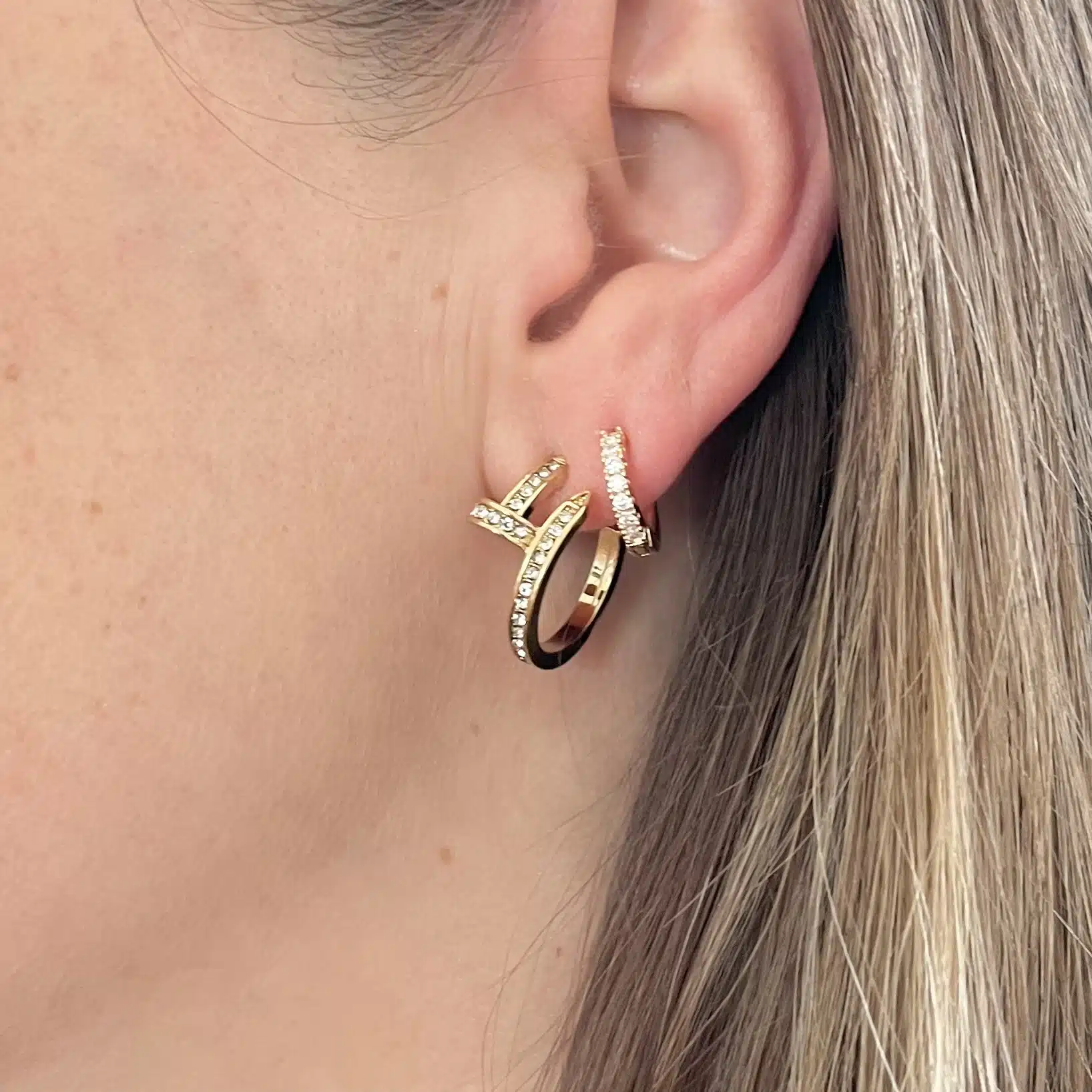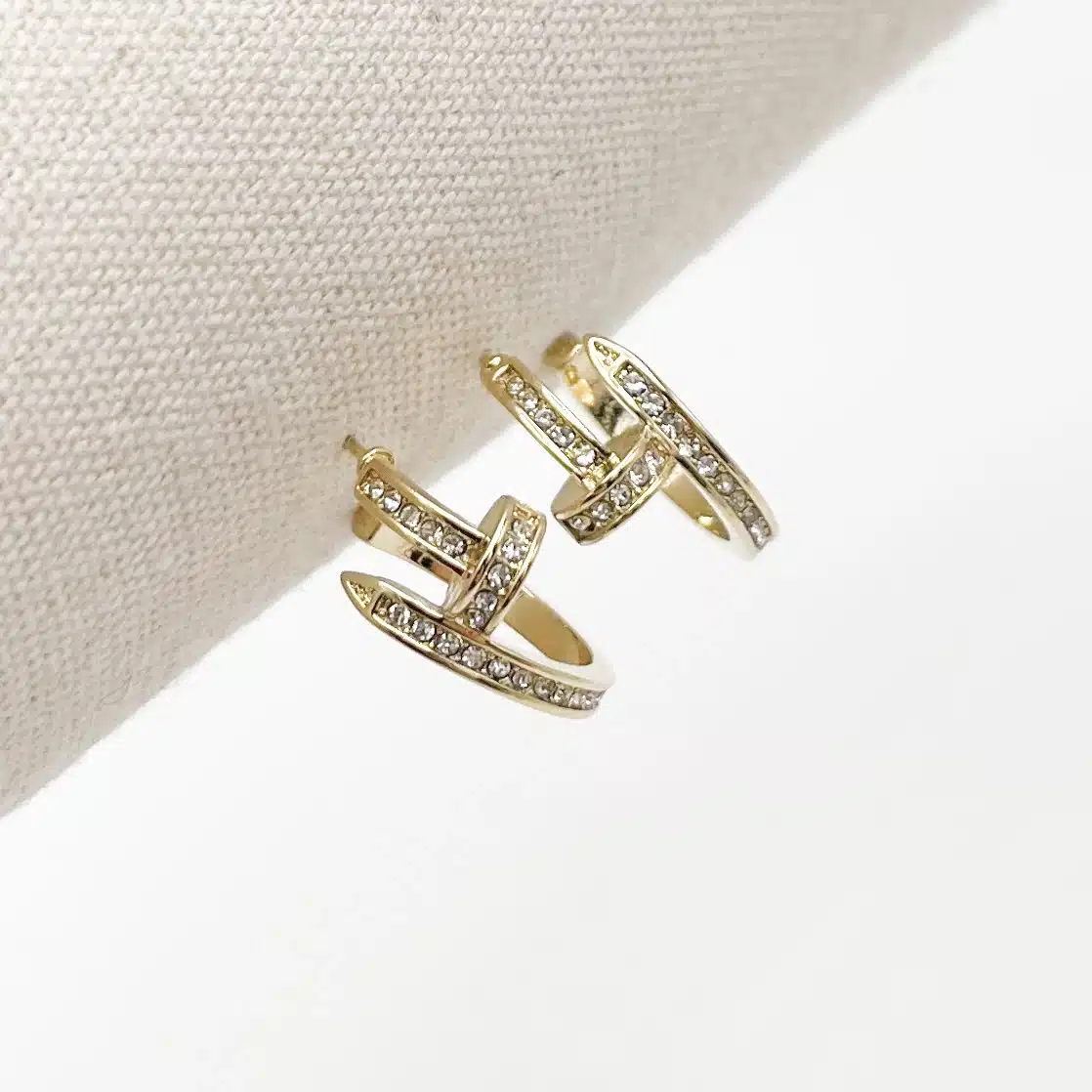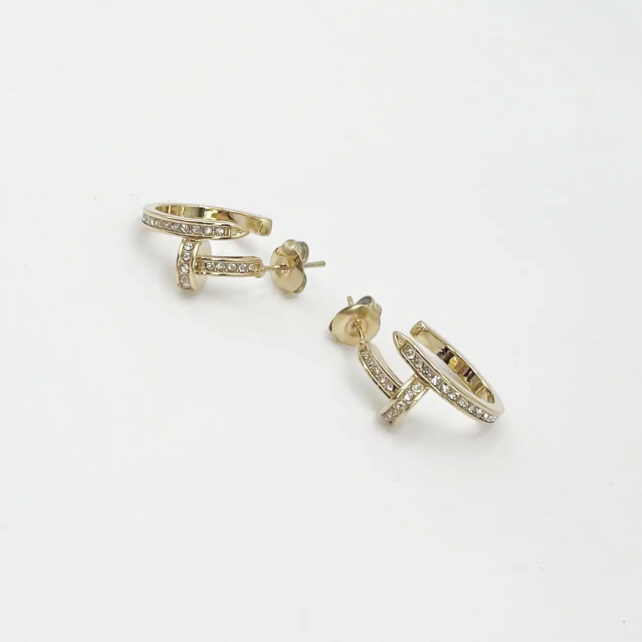 - Jolies boucles d’oreilles composées de deux créoles en forme de clou serties d’une ribambelle de petits strass blancs