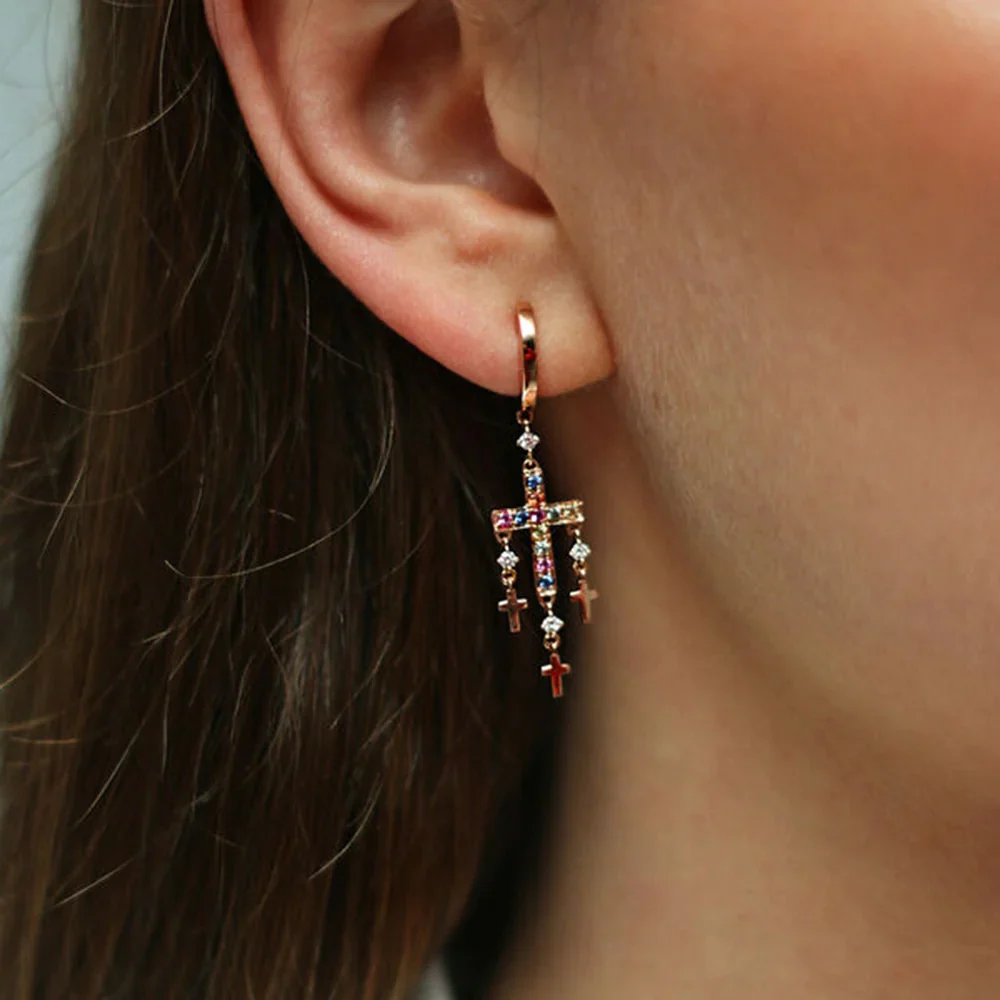 Ornées de cristaux en zirconium scintillants, elles captent la lumière et ajoutent une touche de glamour à votre tenue. Chaque boucle d’oreille présente une croix principale suspendue, créant un effet visuel saisissant. Sur la croix principale, de petites croix délicates se balancent, ajoutant une dimension supplémentaire à leur design.