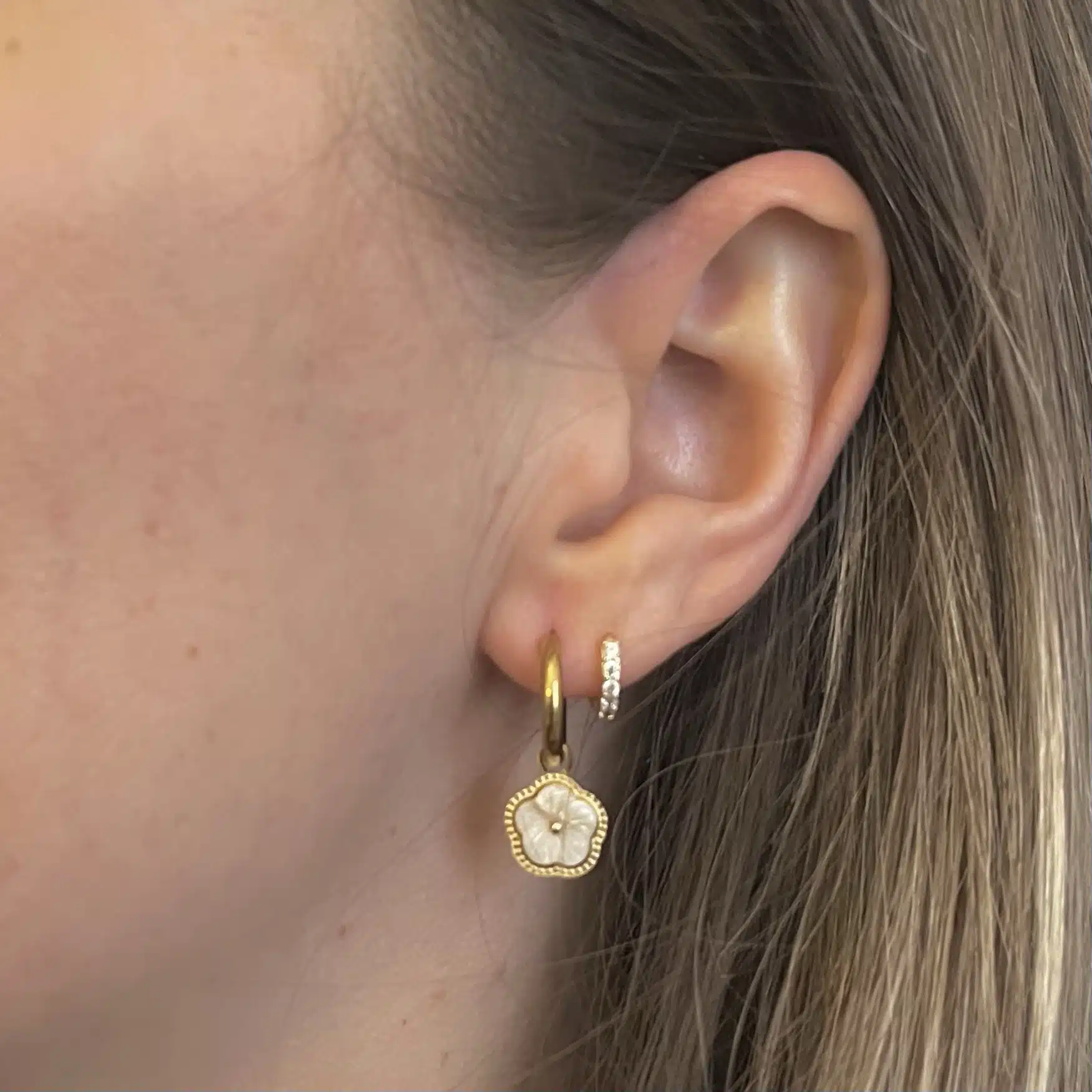 - Jolies boucles d’oreilles composées de deux mini créoles et pendentifs en forme de fleur avec pierre de nacre