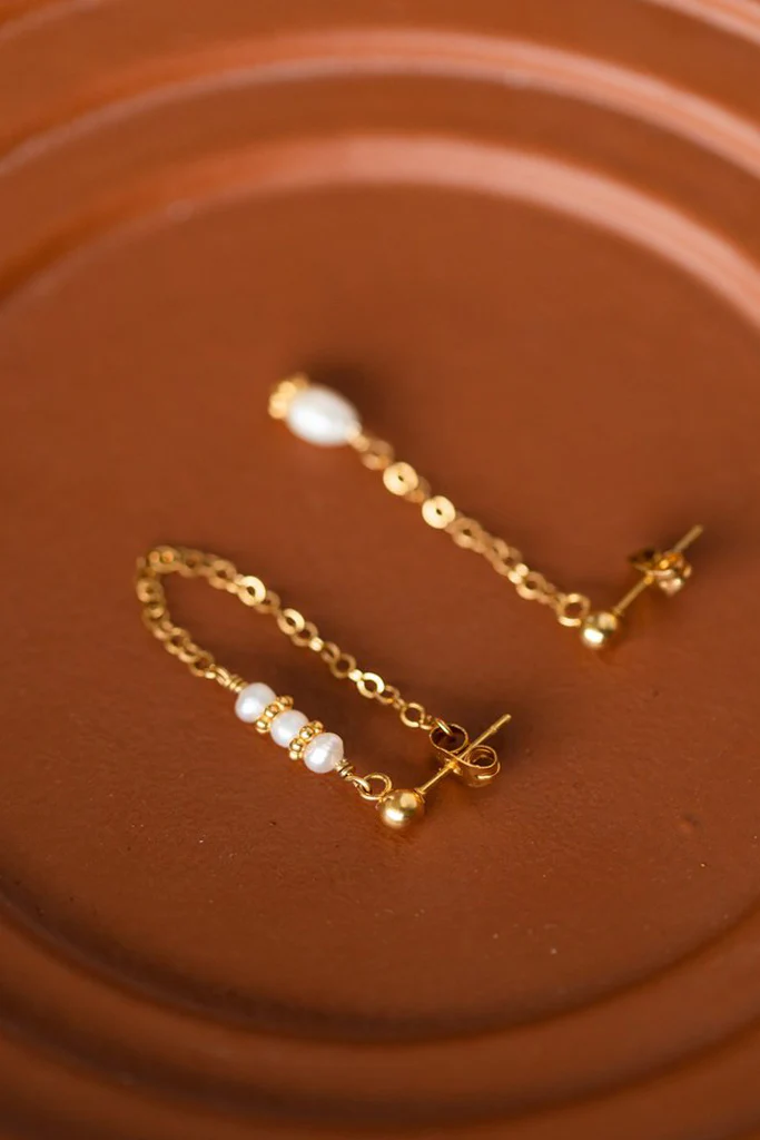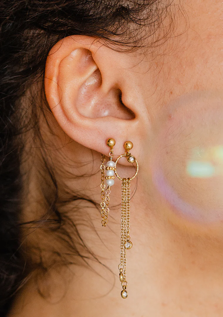 Les boucles asymétriques Éléia sont fabriquées à la main dans mon atelier, Elles sont composées d’une puce ronde décorée d’une chaîne aux maillons ovales, de perles dorées et de perles d’eau douce,