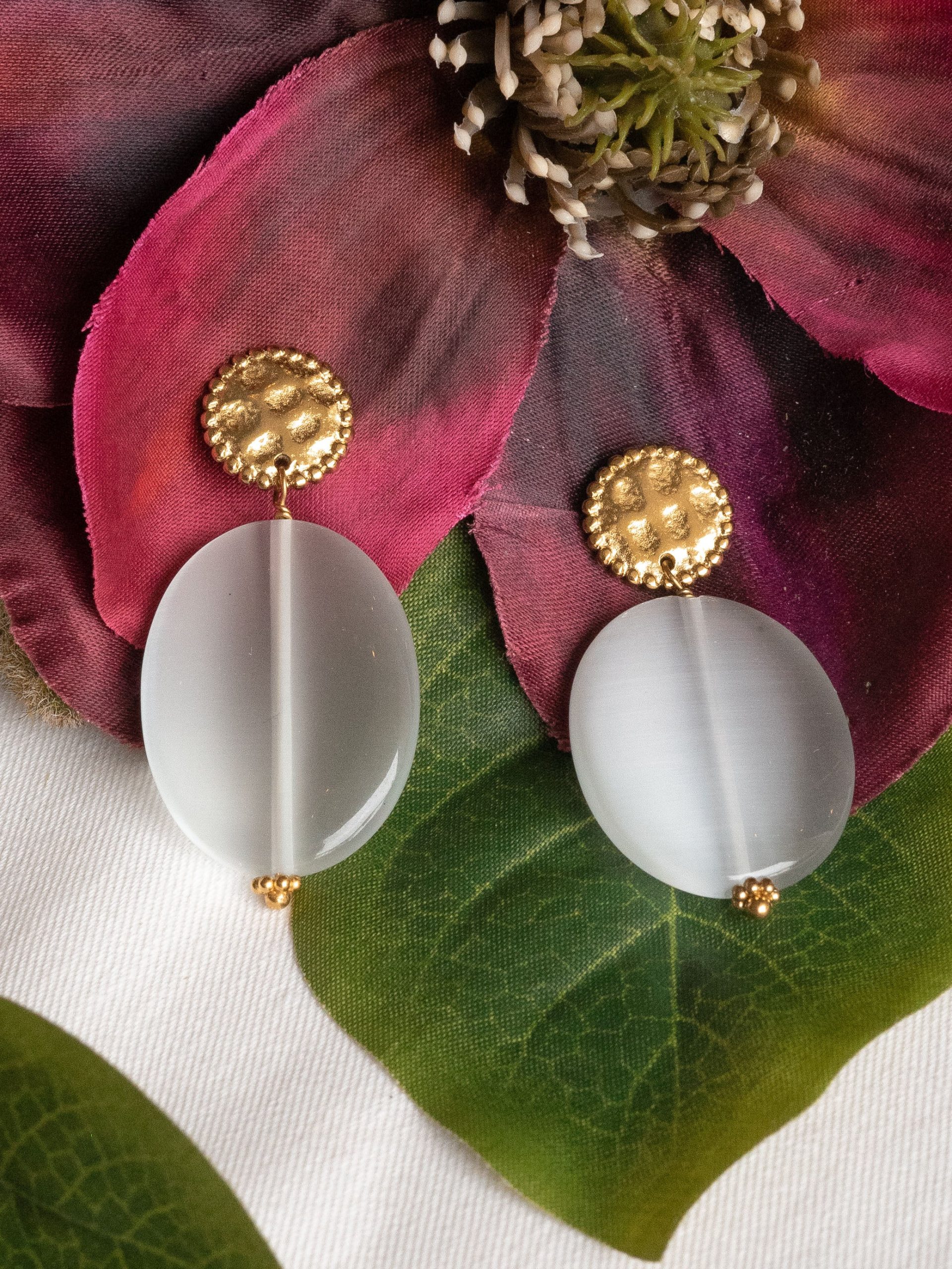 Les boucles Mariam sont fabriquées à la main dans mon atelier. Elles sont composées d’une puce ronde et martelée, décorée d’un pendant composé de perles en oeil de chat aux multiples reflets et de perles dorées.