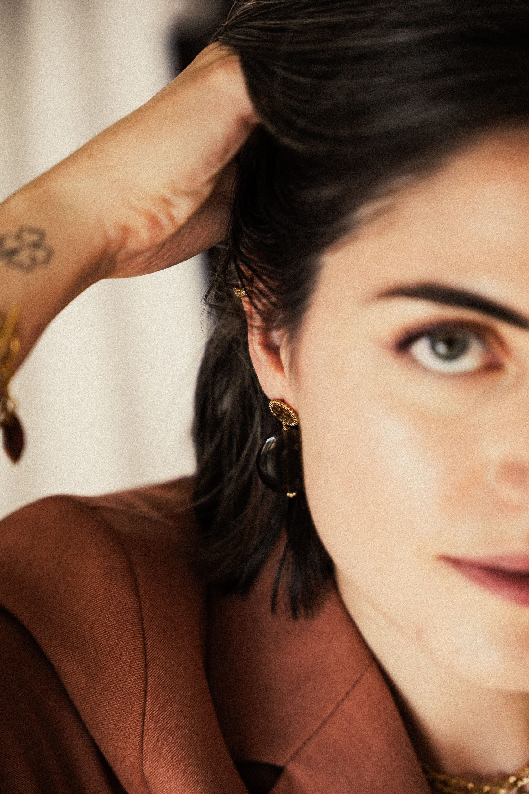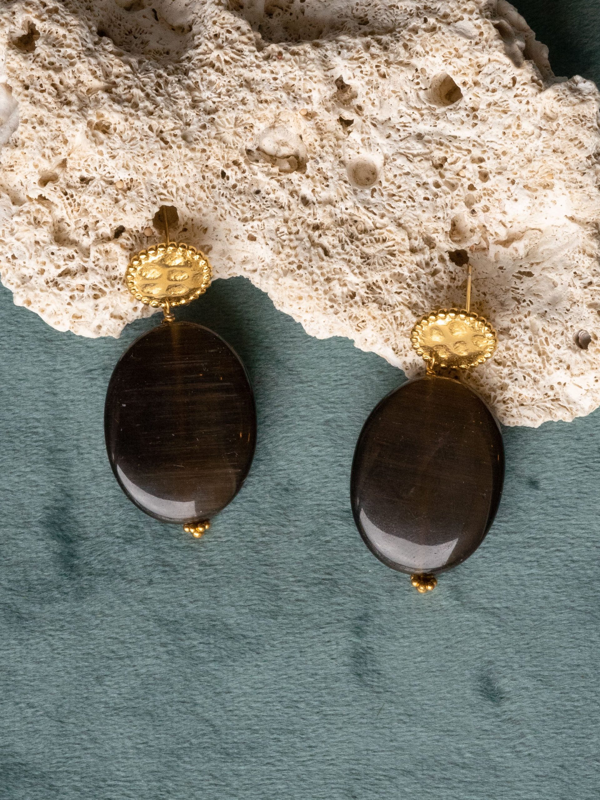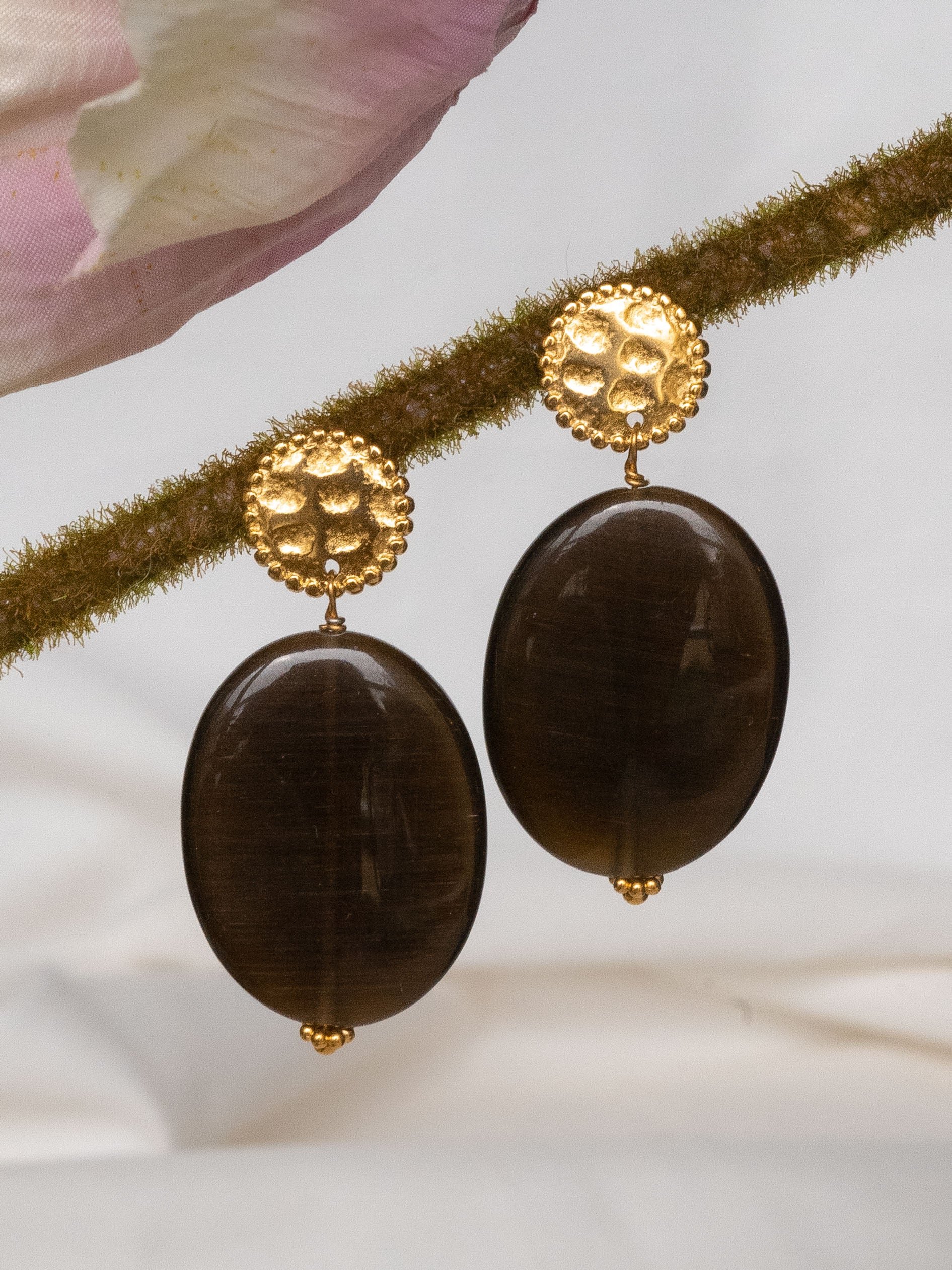 Les boucles Mariam sont fabriquées à la main dans mon atelier. Elles sont composées d’une puce ronde et martelée, décorée d’un pendant composé de perles en oeil de chat aux multiples reflets et de perles dorées.