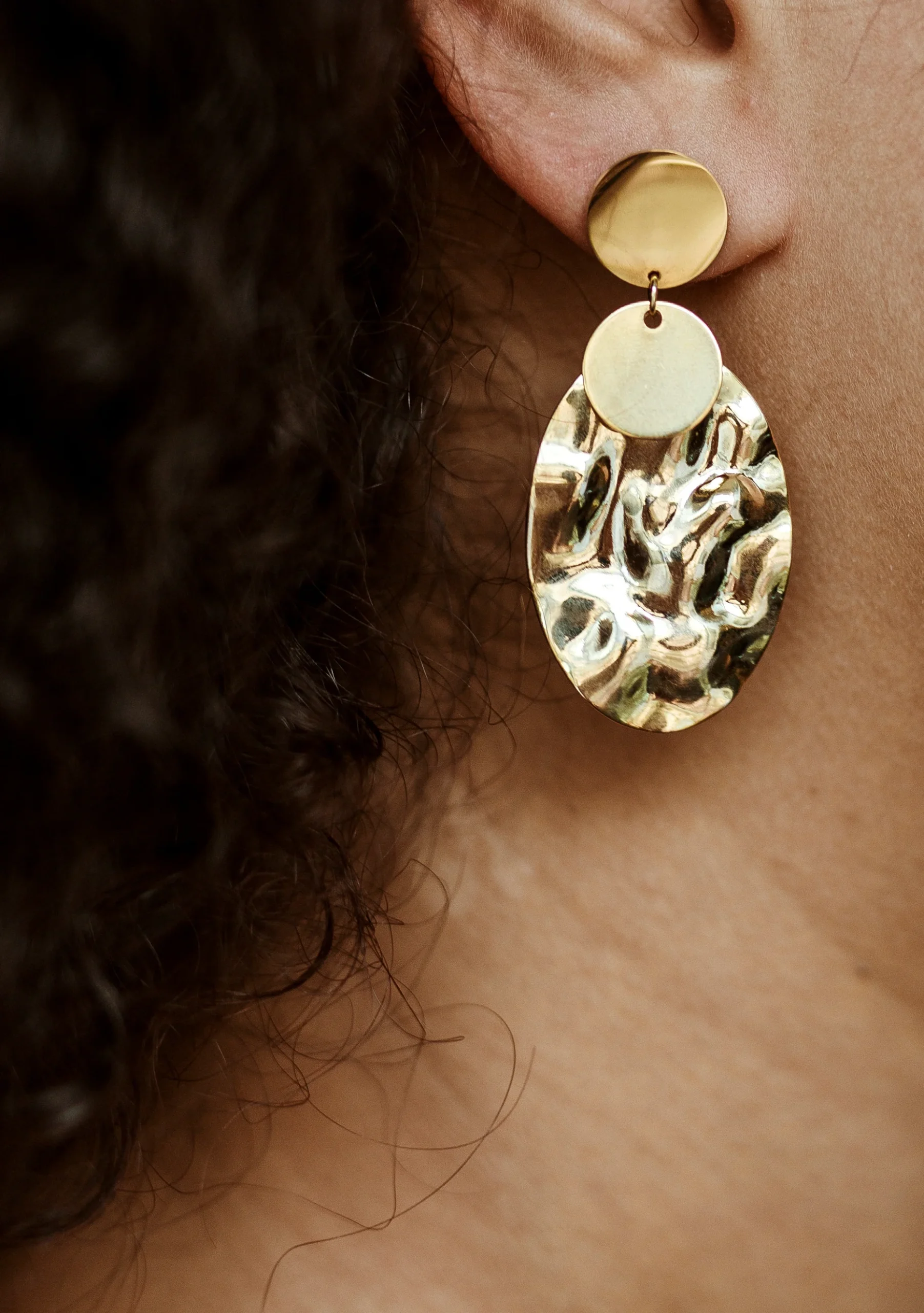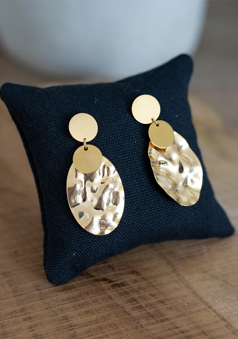 Les boucles Oro sont fabriquées à la main dans mon atelier, Elles sont composées de médailles rondes et lisses ainsi que d’une médaille martelée ovale,