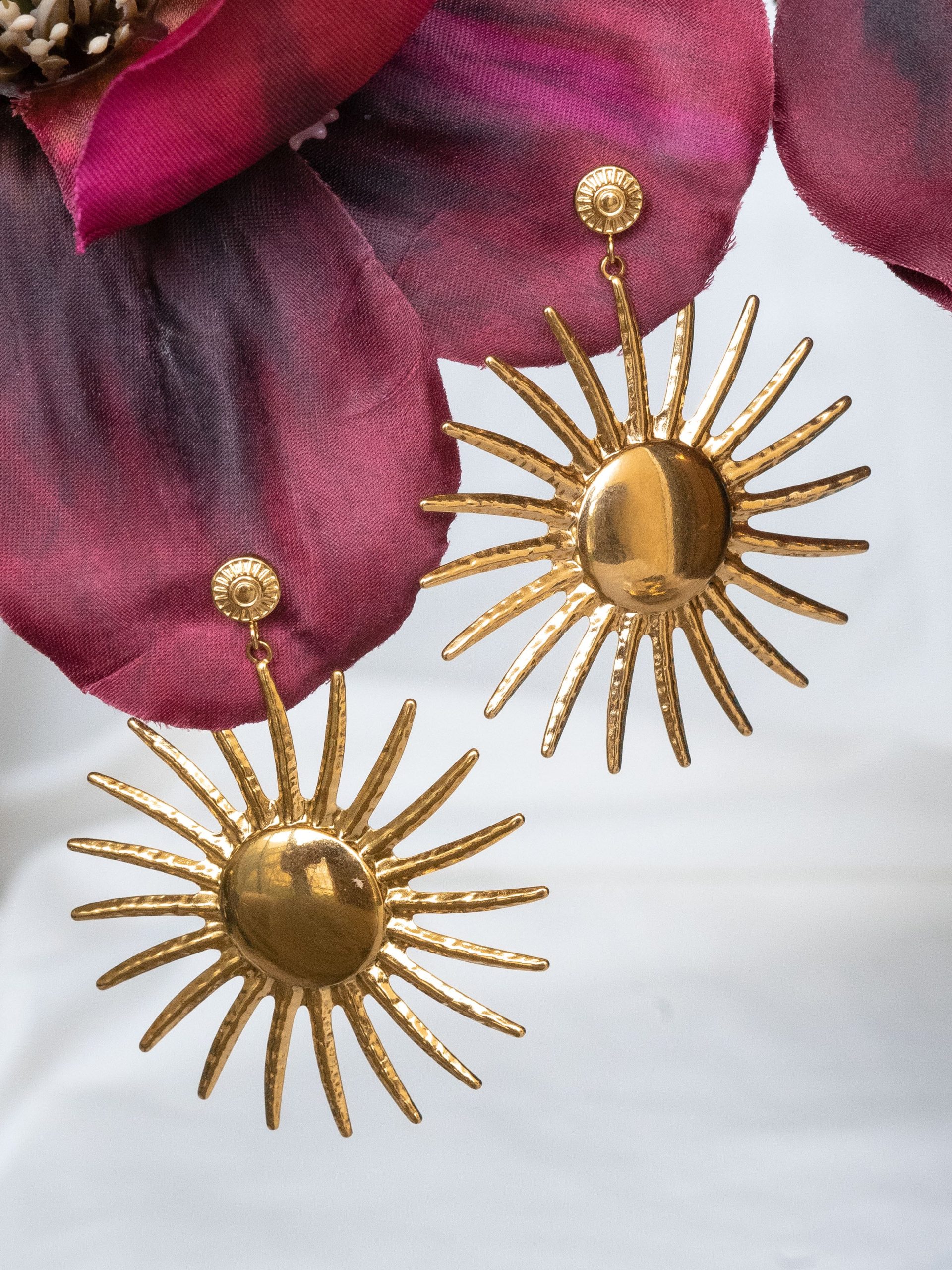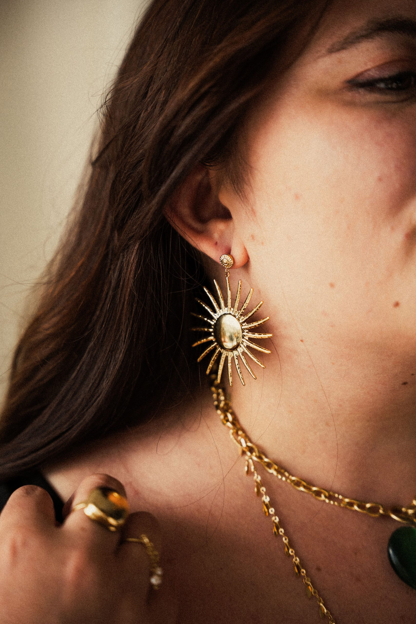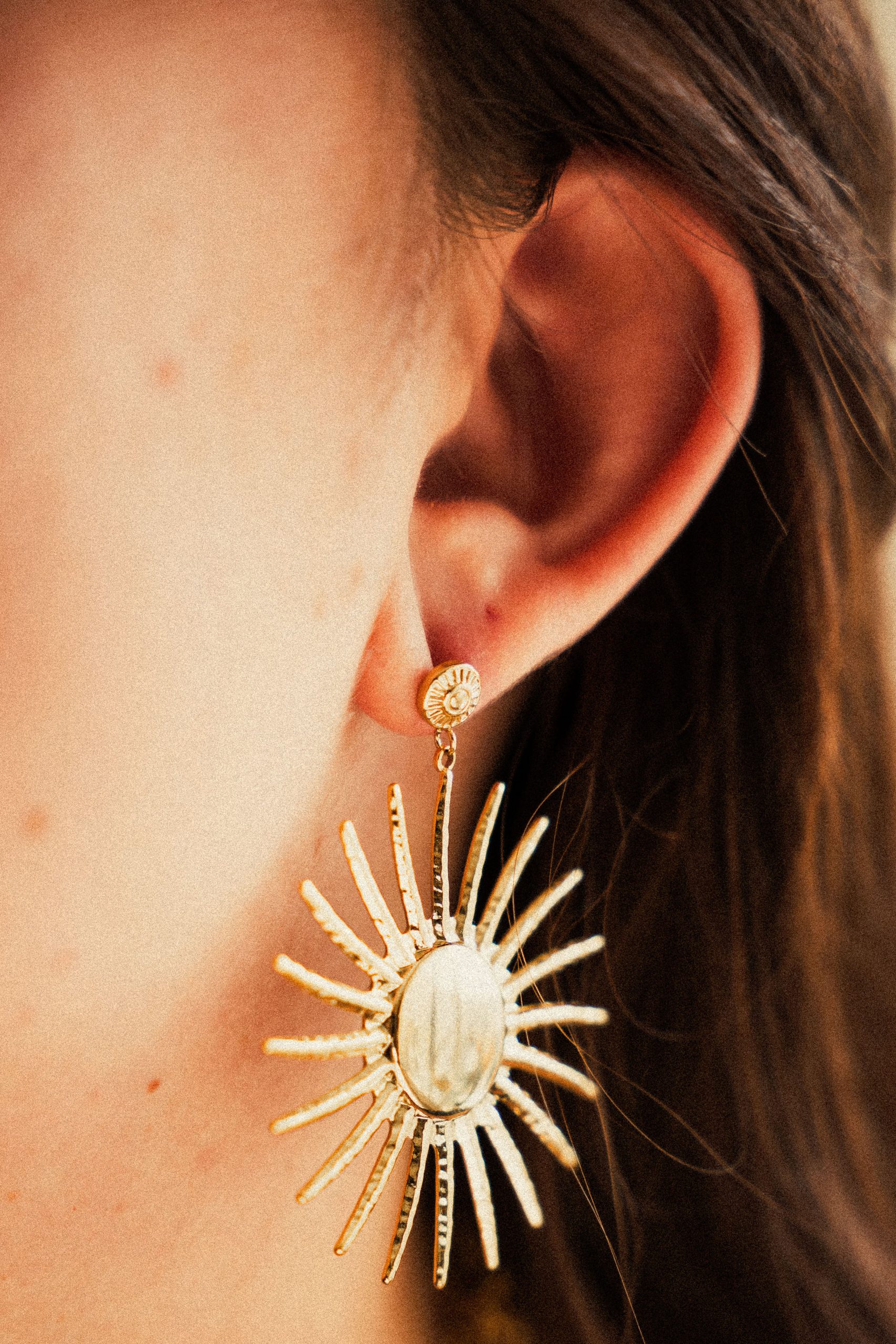 Les boucles Soledad sont fabriquées à la main dans mon atelier, Elles sont composées d’une puce ronde décorée d’un pendant en forme de soleil.