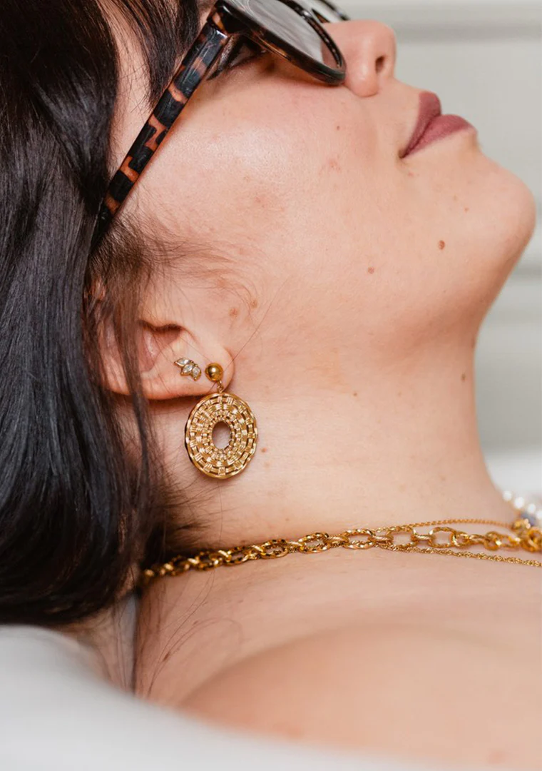 Les boucles Victoria sont fabriquées à la main dans mon atelier, Elles sont composées de puces rondes décorées d’une estampe ovale qui donne l’illusion de fils de métal tressés,