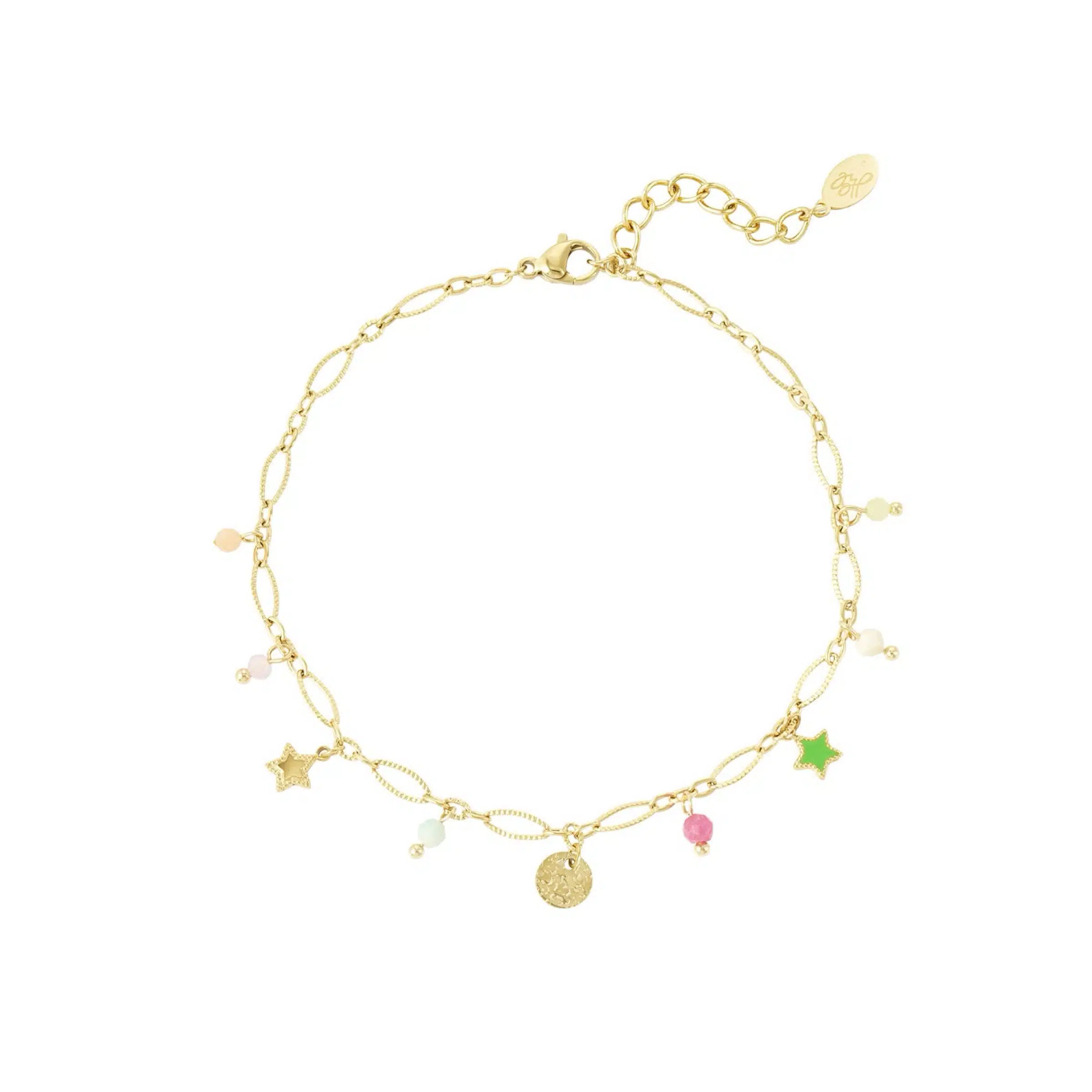 - Bracelet de cheville acier inoxydable composé d’une chaine assez large à grosse maille rovalr avec petits pendentifs de perles d’eau douce, étoiles émaillées de couleur et pampille ronde