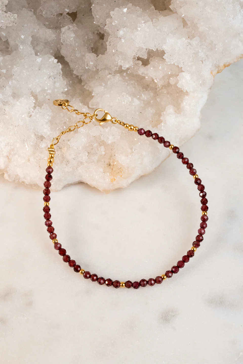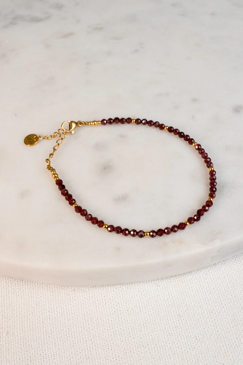 Le bracelet Alya est fabriqué à la main dans mon atelier, Il est composé de Grenats et de quelques perles dorées,