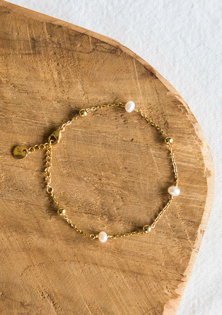 Le bracelet Anita est fabriqué à la main dans mon atelier, Il est composé d’une fine chaine décorée de billes dorées sur laquelle sont tissé des perles d’eau douce,