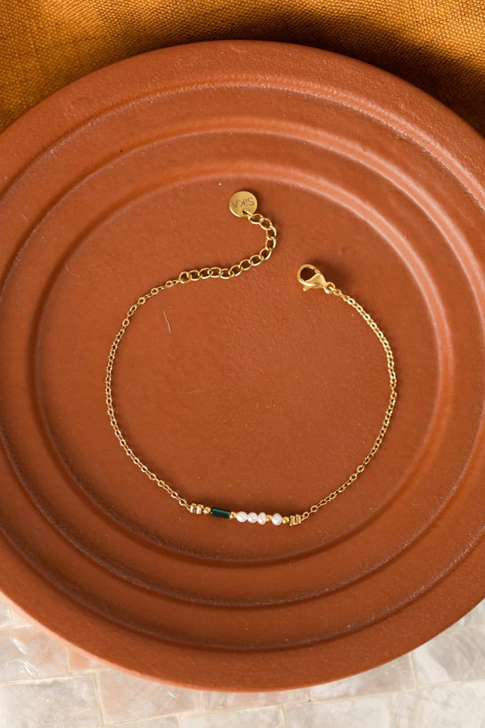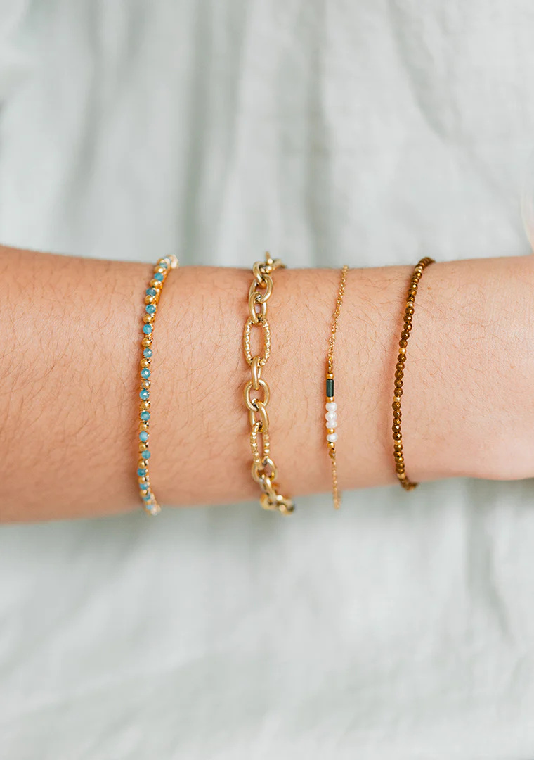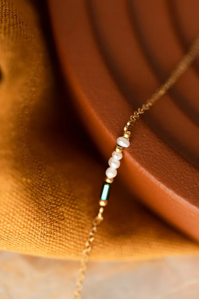 Le bracelet Baya est fabriqué à la main dans mon atelier, Il est monté sur une chaîne aux maillons ovales est striés et orné de perles d’eau douce rondes ainsi que d’une Hématite kaki en forme de tube,