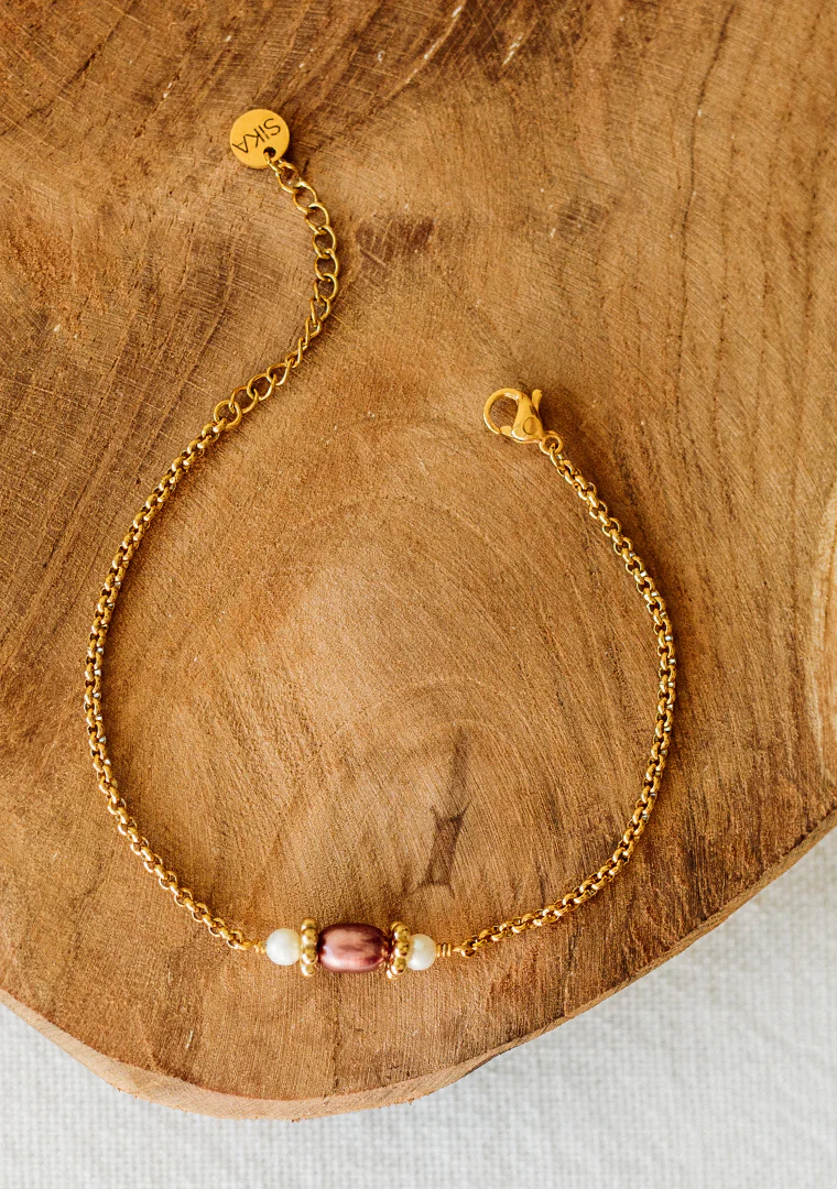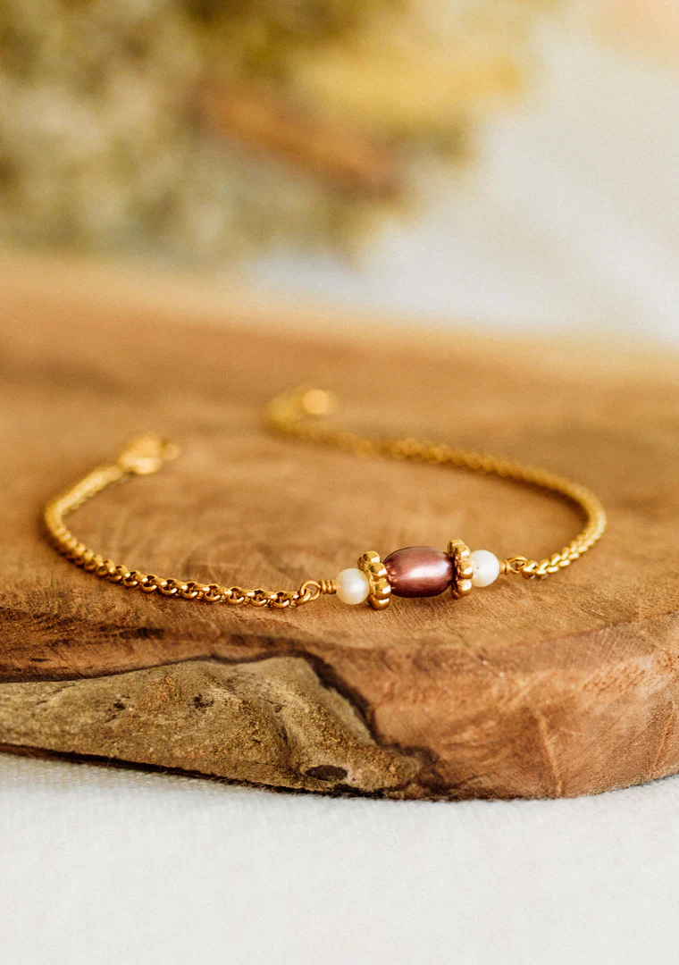 Le bracelet Calypso est fabriqué à la main dans mon atelier, Il est composé d’une fine chaines à maillons ronds décorée de quelques perles dorées ainsi que de Perles d’eau douce blanches et rose,