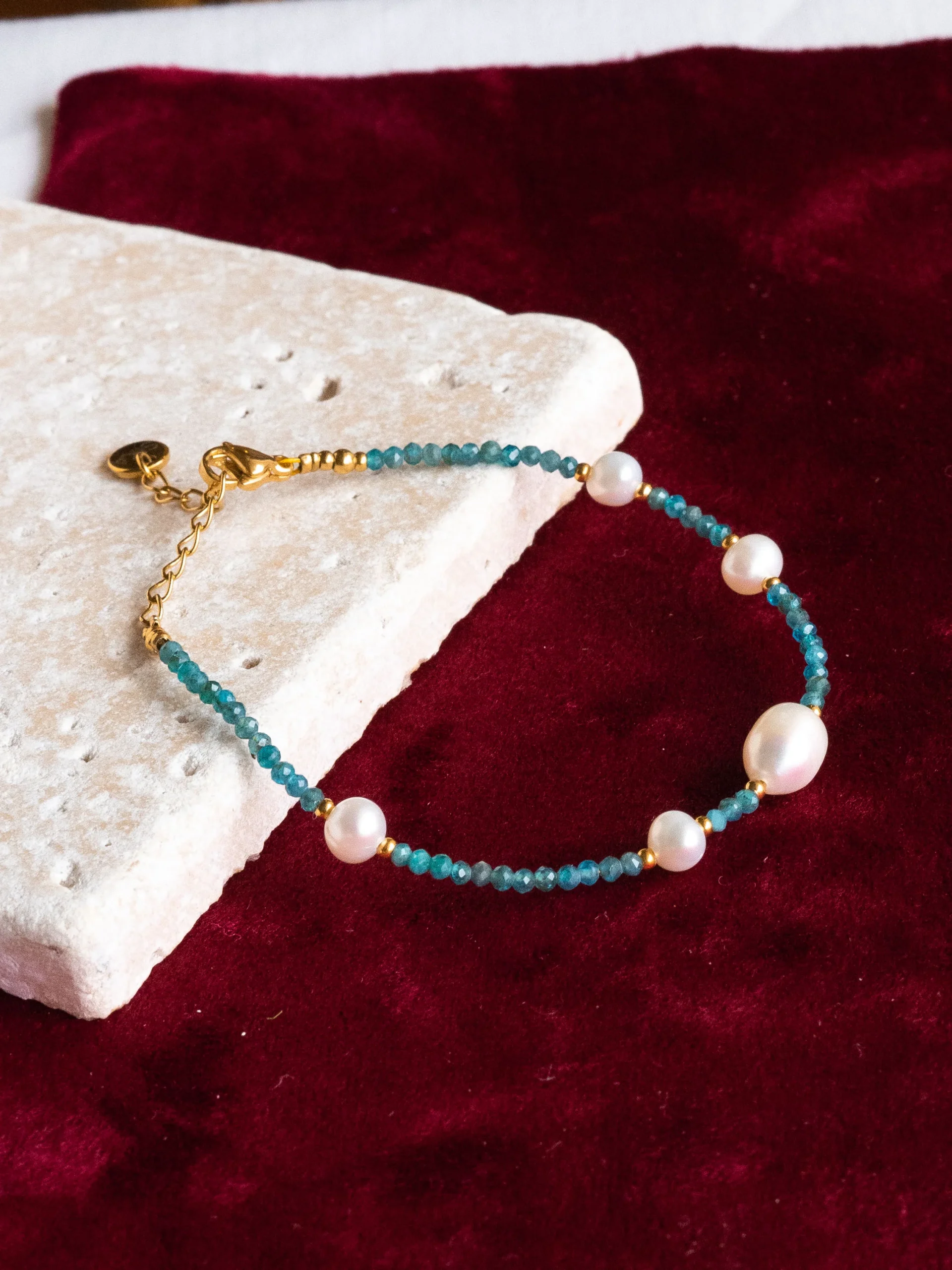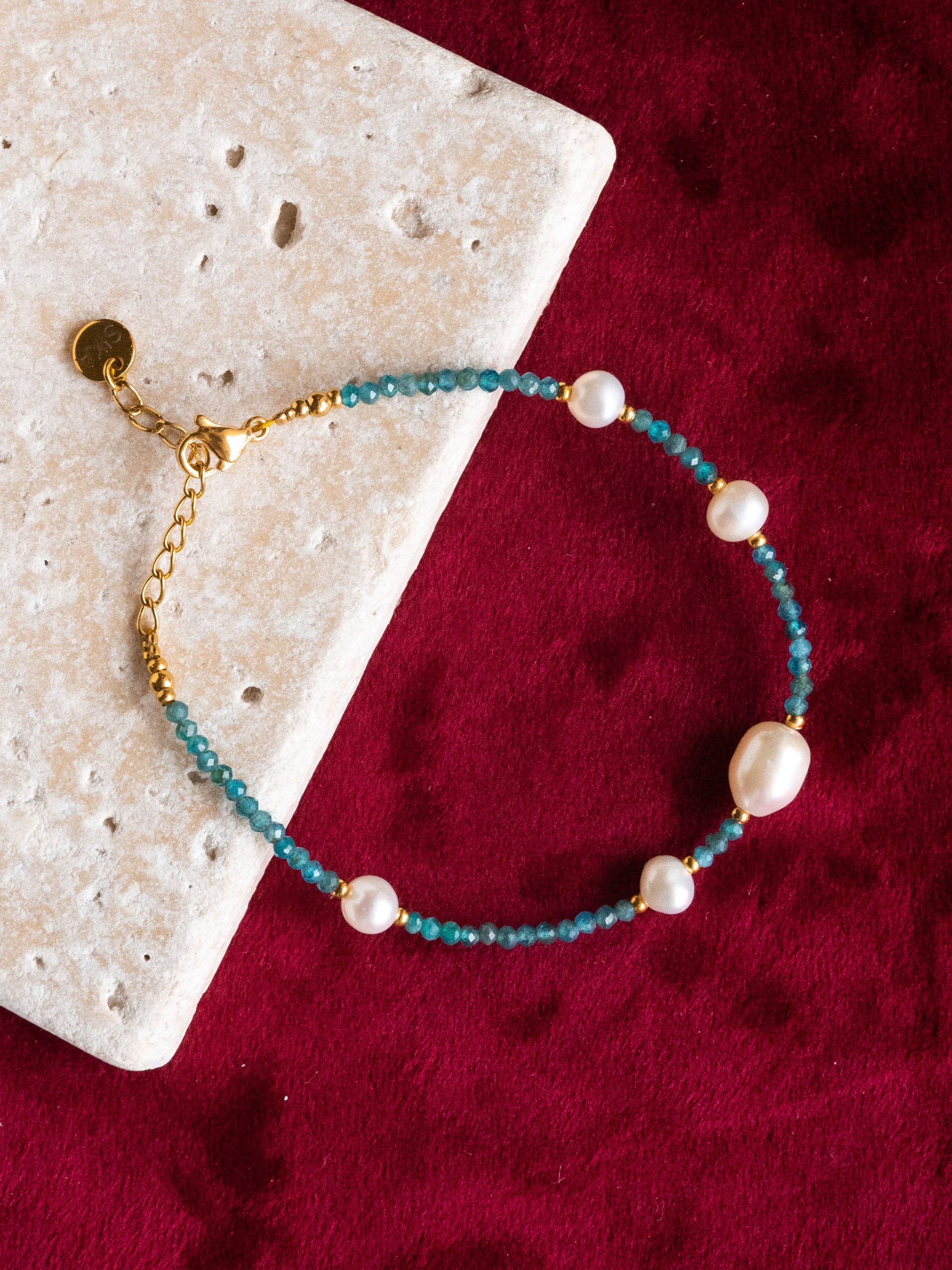 Le bracelet Cassian est fabriqué à la main dans mon atelier. Il est composé d’Apatites, de Perles d’eau douce et de quelques perles dorées.