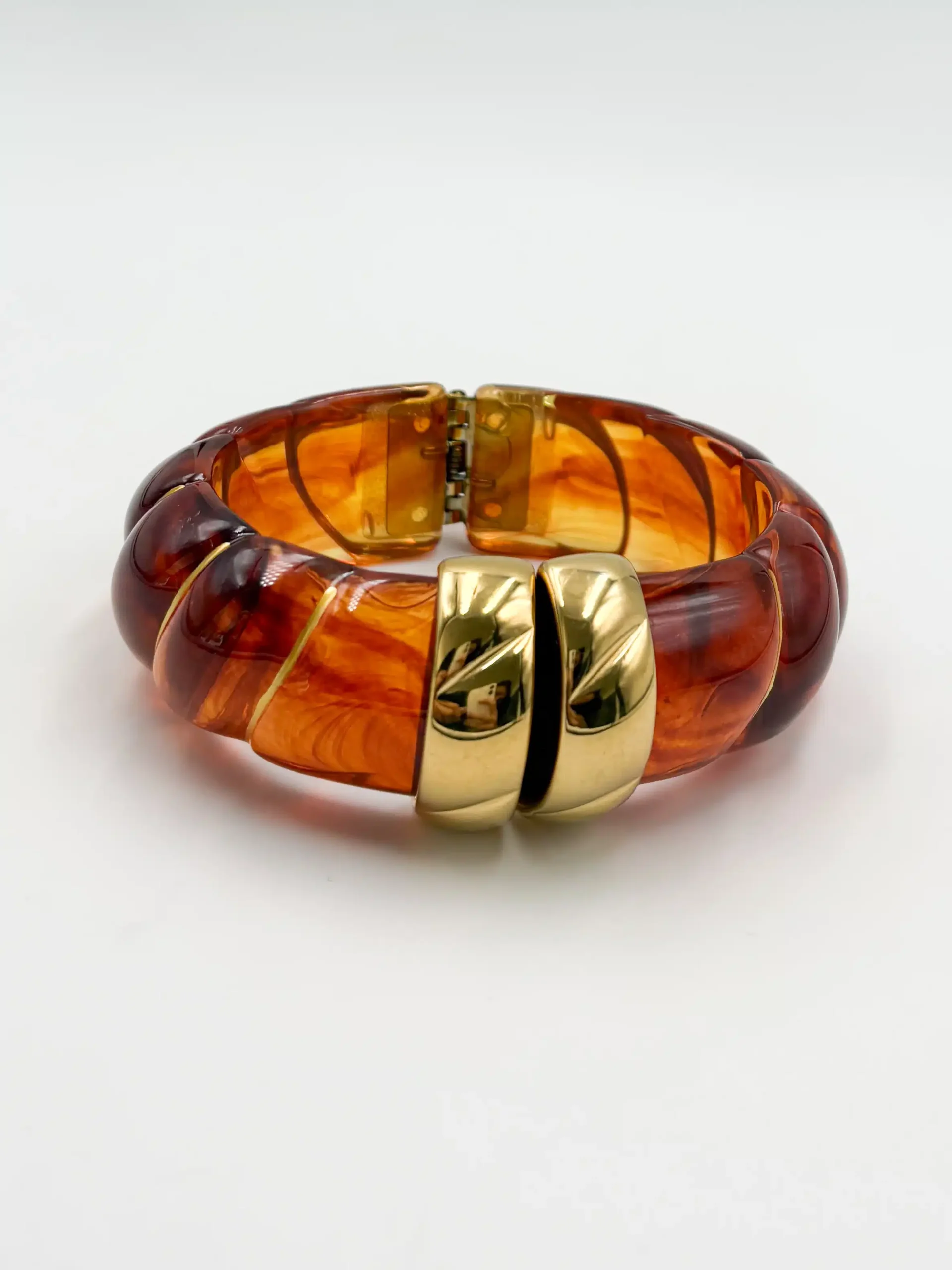 Bracelet torsadé de type jonc, manchette, en acier inoxydable et acétate de couleur ambre