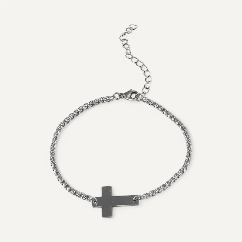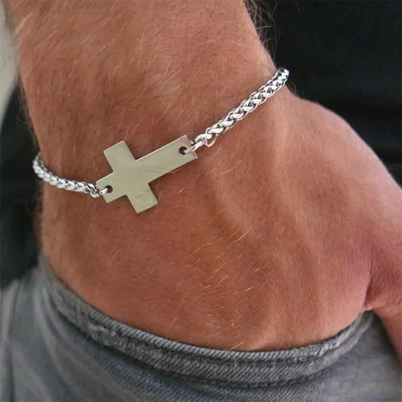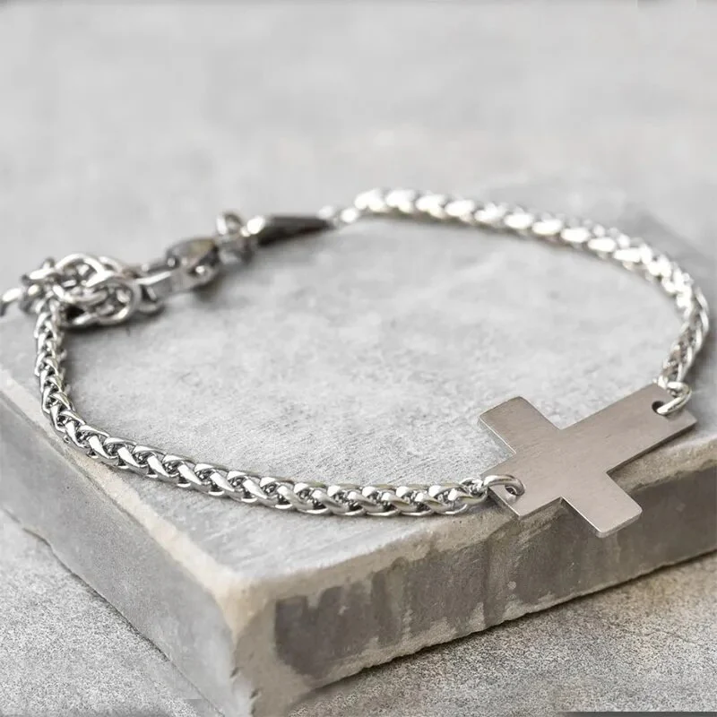 Découvrez l’harmonie entre robustesse et spiritualité avec notre bracelet en chaîne argentée, agrémenté d’un pendentif croix.