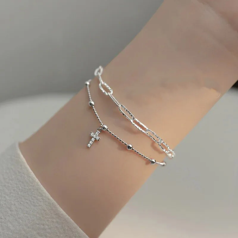 Fabriqué en argent brillant, chaque détail a été conçu avec une intention précise. Il se compose de deux chaînes délicates et harmonieuses : l’une avec de petites billes d’argent espacées de manière égale, l’autre d’une chaîne plus simple et épurée. Ensemble, elles créent un équilibre visuel et une texture variée.