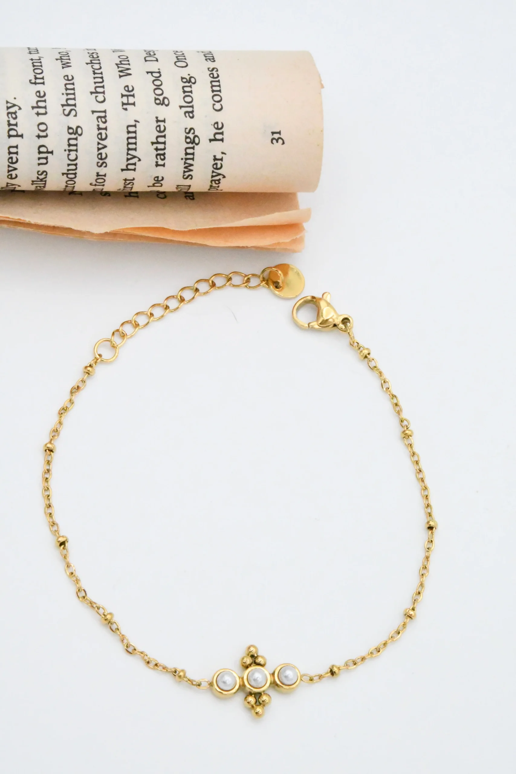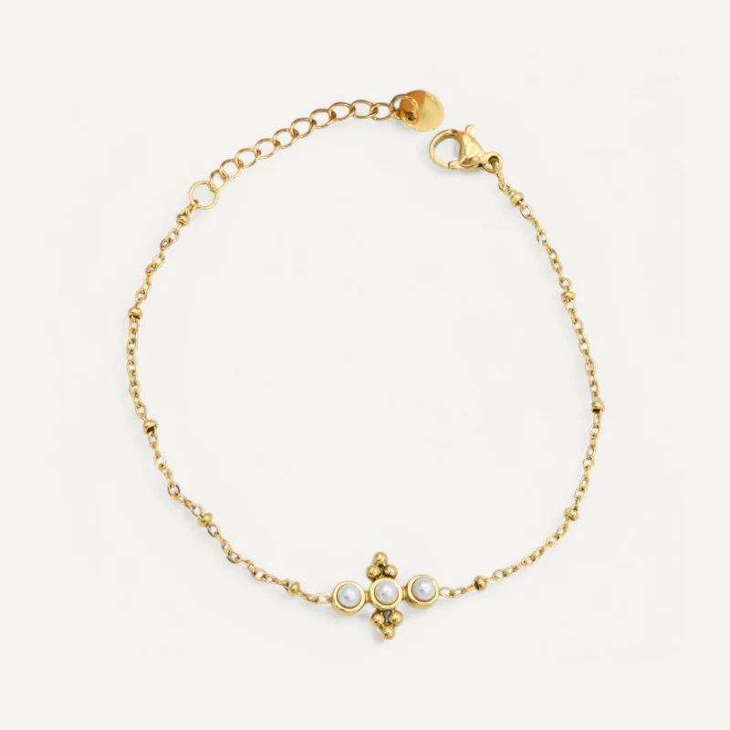 Sa chaîne dorée à l’acier inoxydable se pare d’une croix stylisée, délicatement ornée de perles nacrées et de finitions en relief, pour une allure aussi douce qu’élégante.Conçu pour allier spiritualité et féminité, ce bijou est idéal à porter au quotidien ou pour une occasion spéciale. Il s’adapte facilement à votre poignet grâce à sa chaînette réglable et son fermoir sécurisé.