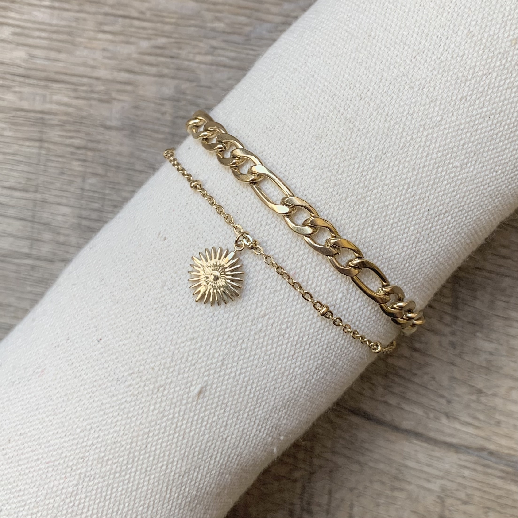 - Une seconde chaine fine avec petites billes et pendentif en forme de soleil