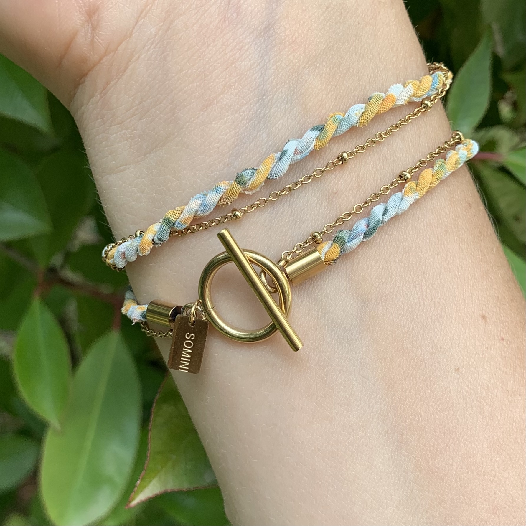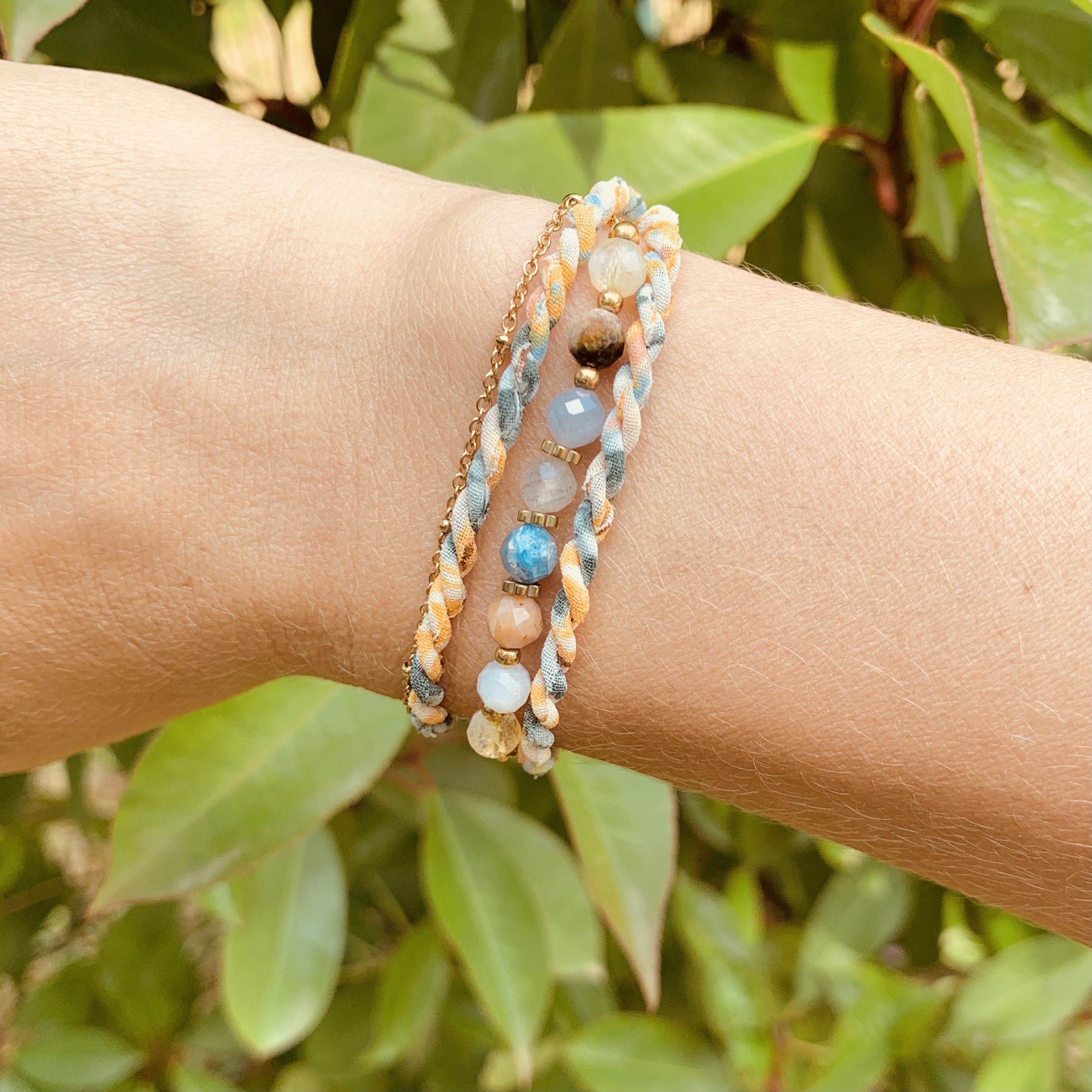 Joli bracelet à double tour composé d’un tissu torsadé estival, d’une fine chaine en acier inoxydable et de petites pierres naturelles facettées