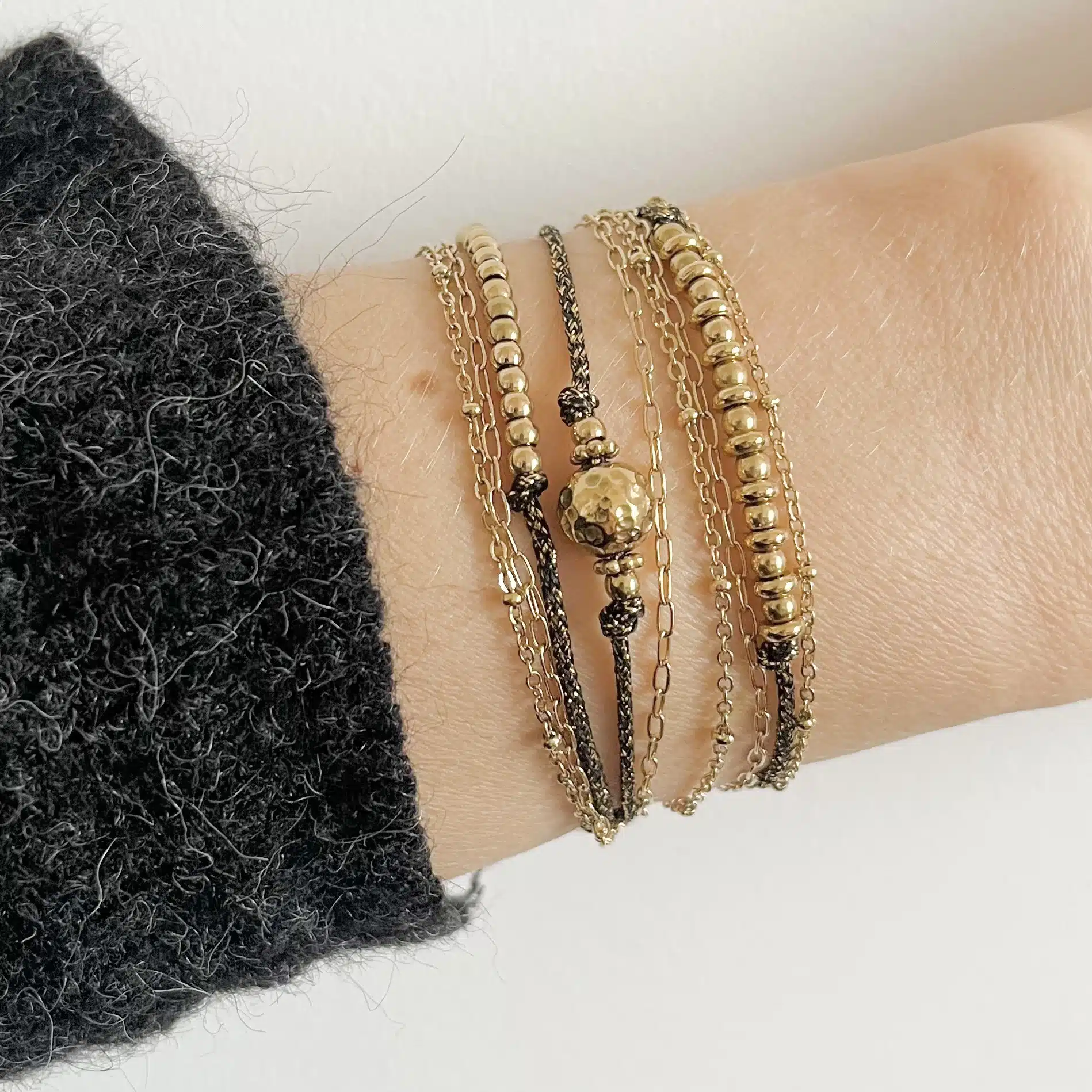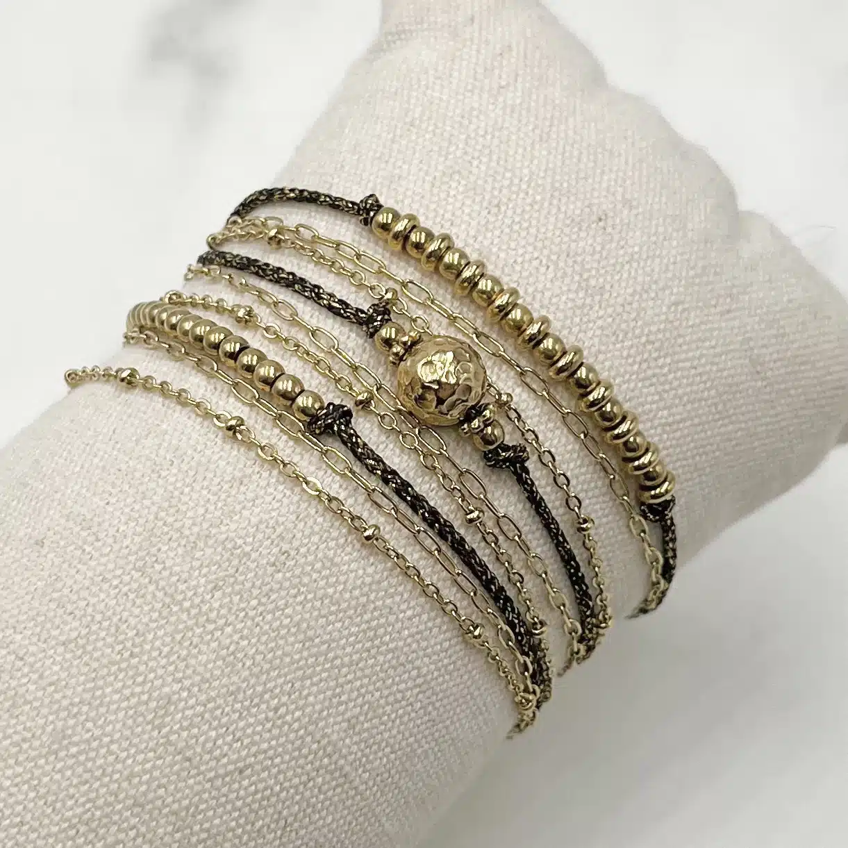 - Bijou faisant deux fois le tour du poignet composé d’une fine chaine en acier inoxydable de couleur dorée avec petites billes, d’un cordon de couleur noire et or, de petites perles d’acier inoxydable de couleur dorée ainsi que d’une perle en acier inoxydable martelé. Le tout relié par un un unique fermoir et une chainette de réglage