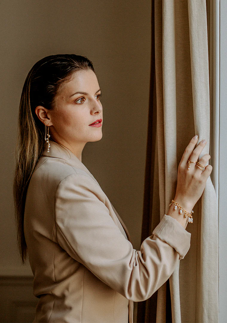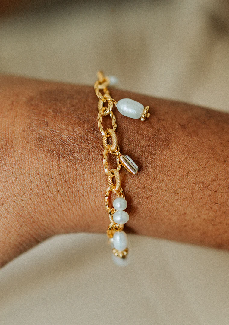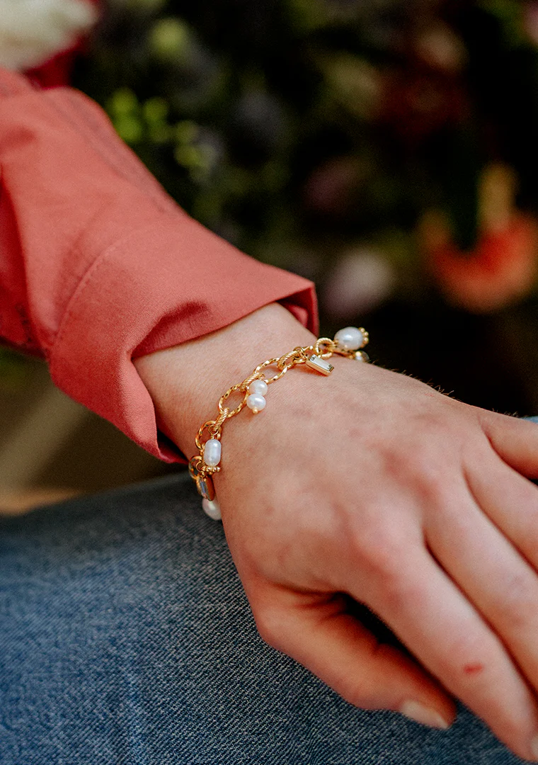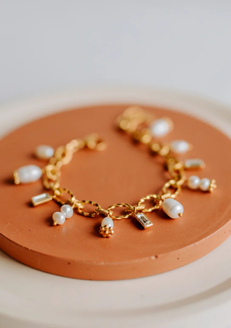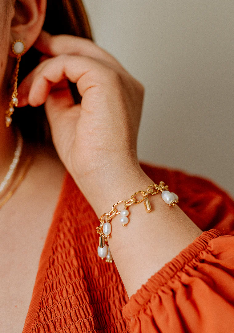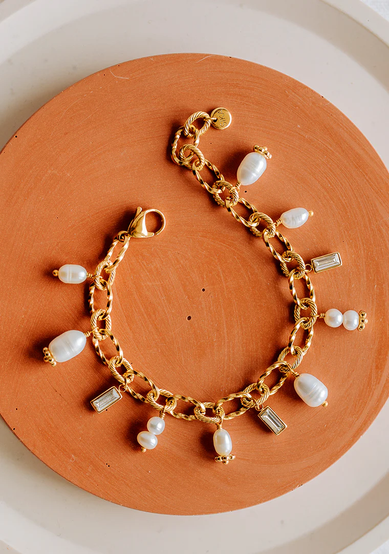 Le bracelet Éléa est fabriqué à la main dans mon atelier, Il est monté sur une chaine aux maillons asymétriques, habillée d’une rivière de pampilles ornées de Perles d’eau douce et de strass,