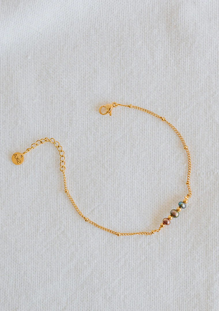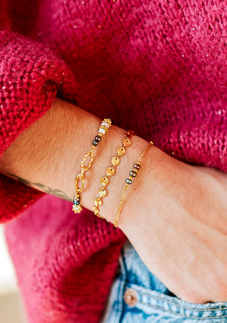 Le bracelet Elsa est fabriqué à la main dans mon atelier, Il est monté sur une fine chaine ornée de petite billes et habillée de quelques perles dorées et de Perles d’eau douce grises,