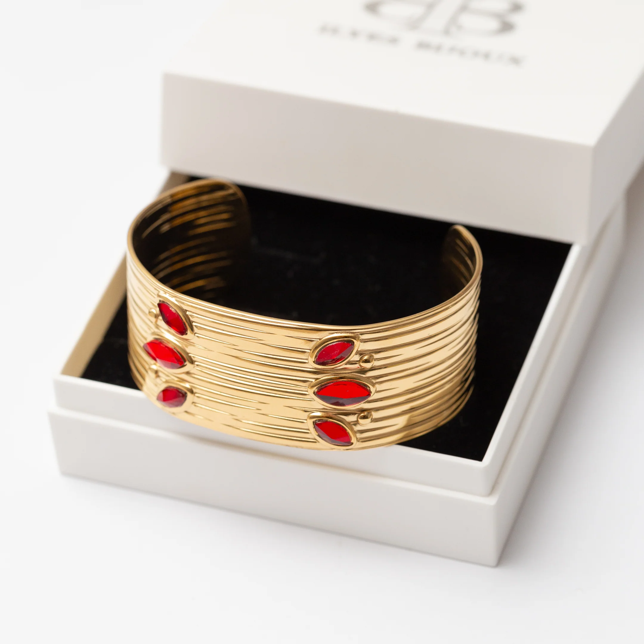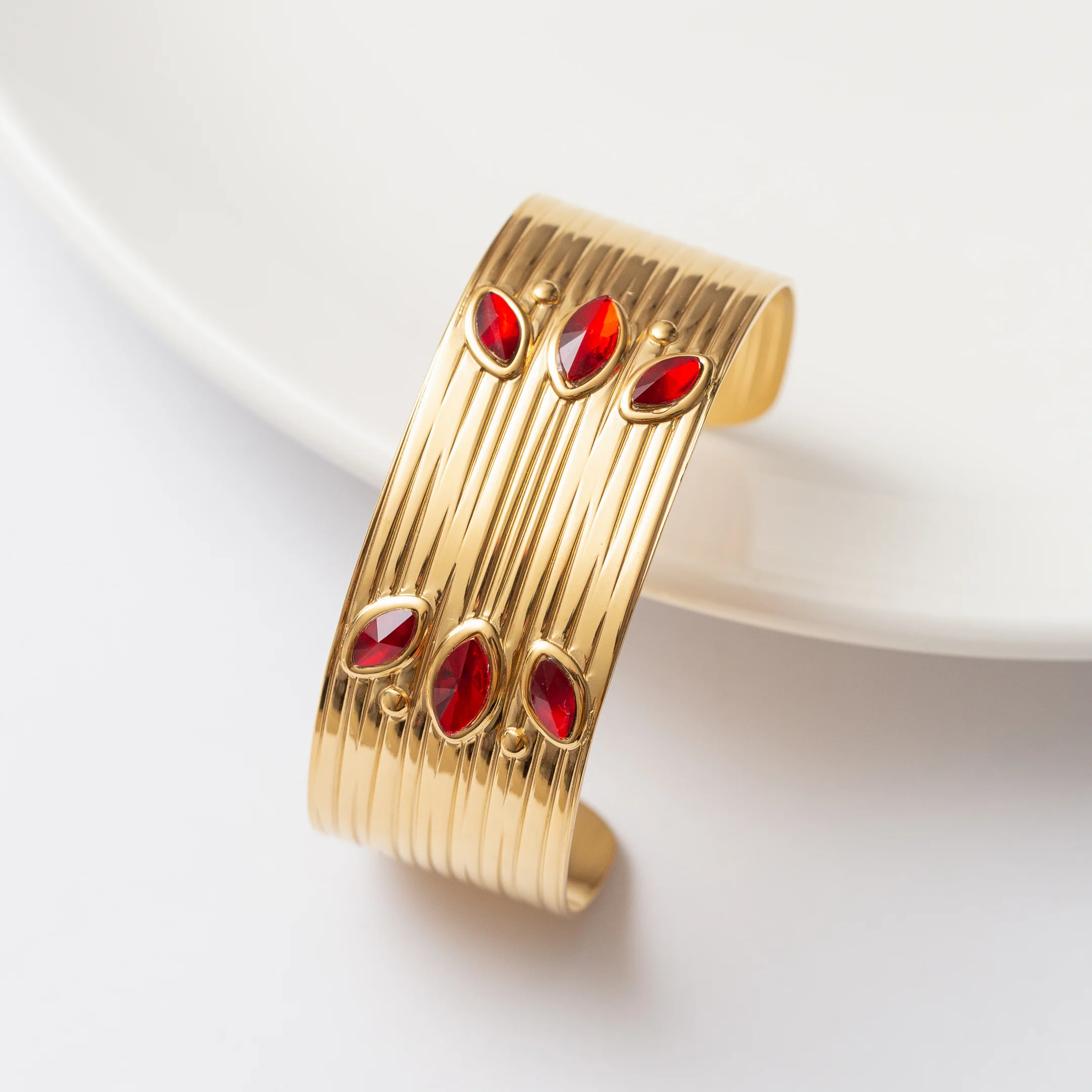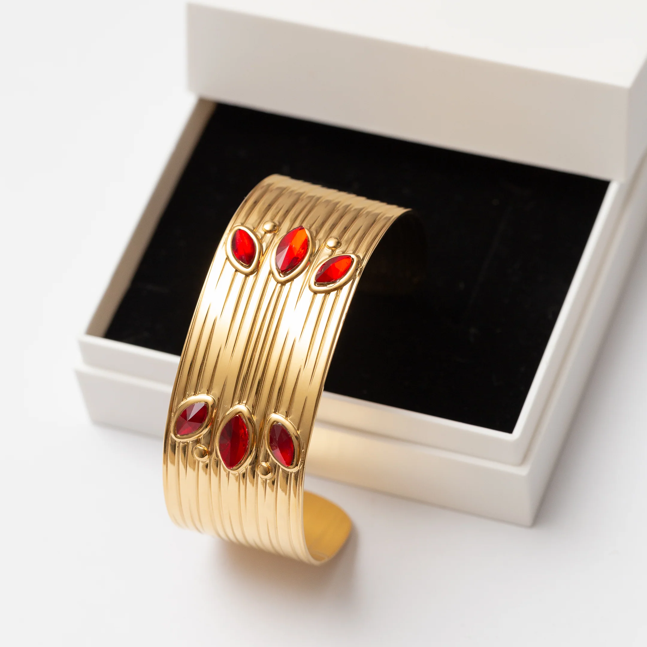 Ce bracelet en acier élégant ajoutera une touche de couleur à votre look avec ses pierres de zirconium rouge. Fabriqué en acier de qualité. Parfait pour une soirée spéciale ou pour tous les jours.