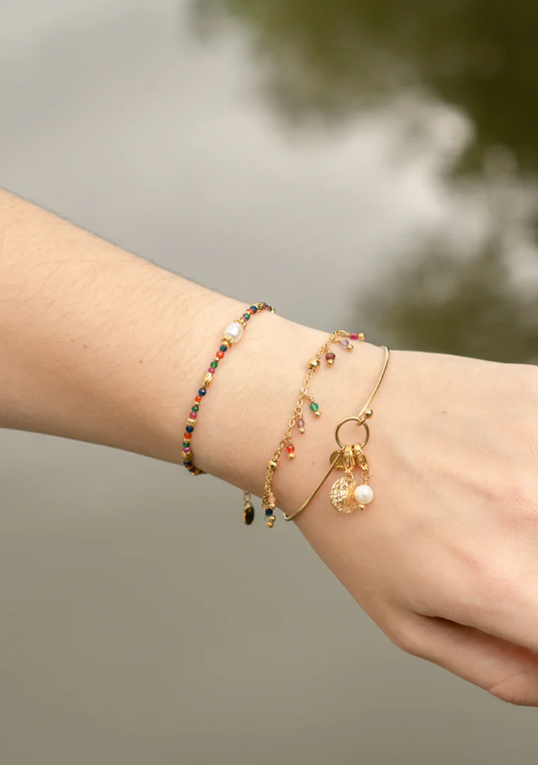 Le bracelet Gaïa est fabriqué à la main dans mon atelier, Il est composé d’une multitude de pierres semi-précieuses multicolores, de perle d’eau douce et de perles dorées,
