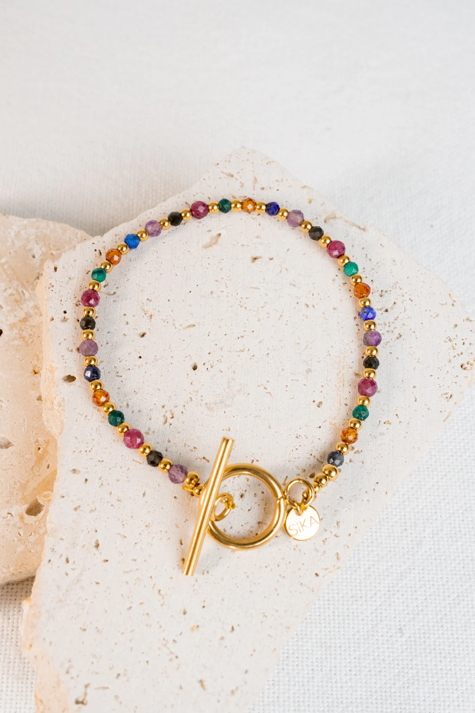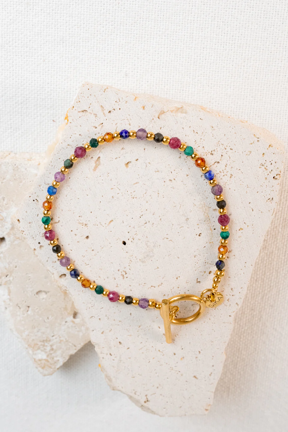 Le bracelet Indira est fabriquée à la main dans mon atelier, Il est composé de diverses pierres semi-précieuses, de perles dorées et d’un fermoir bâton,