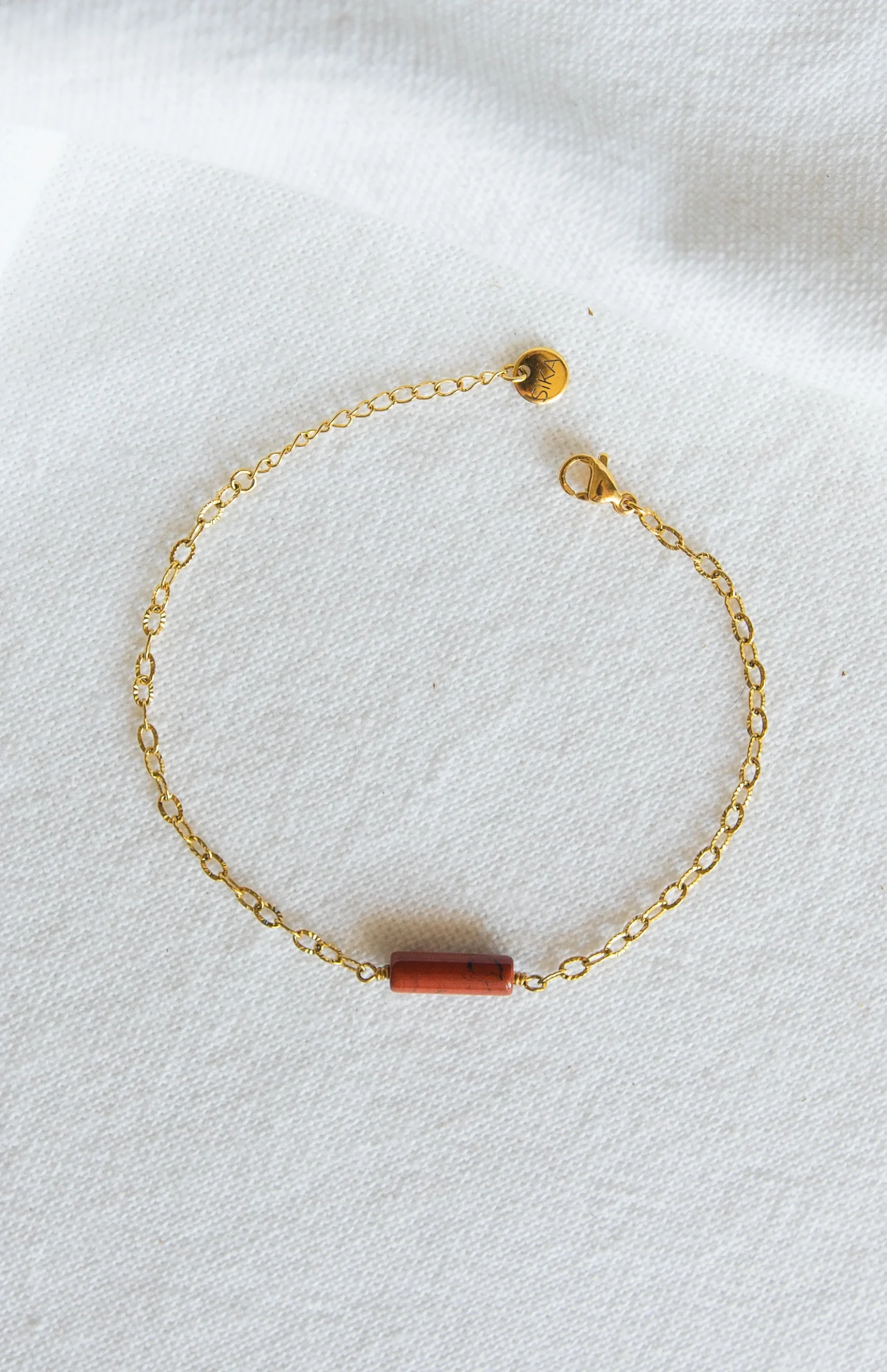Le Bracelet Isa est fabriqué à la main dans mon atelier, Il est monté sur une chaine aux maillons ovales striés et décoré d’une perle en Jaspe rouge,