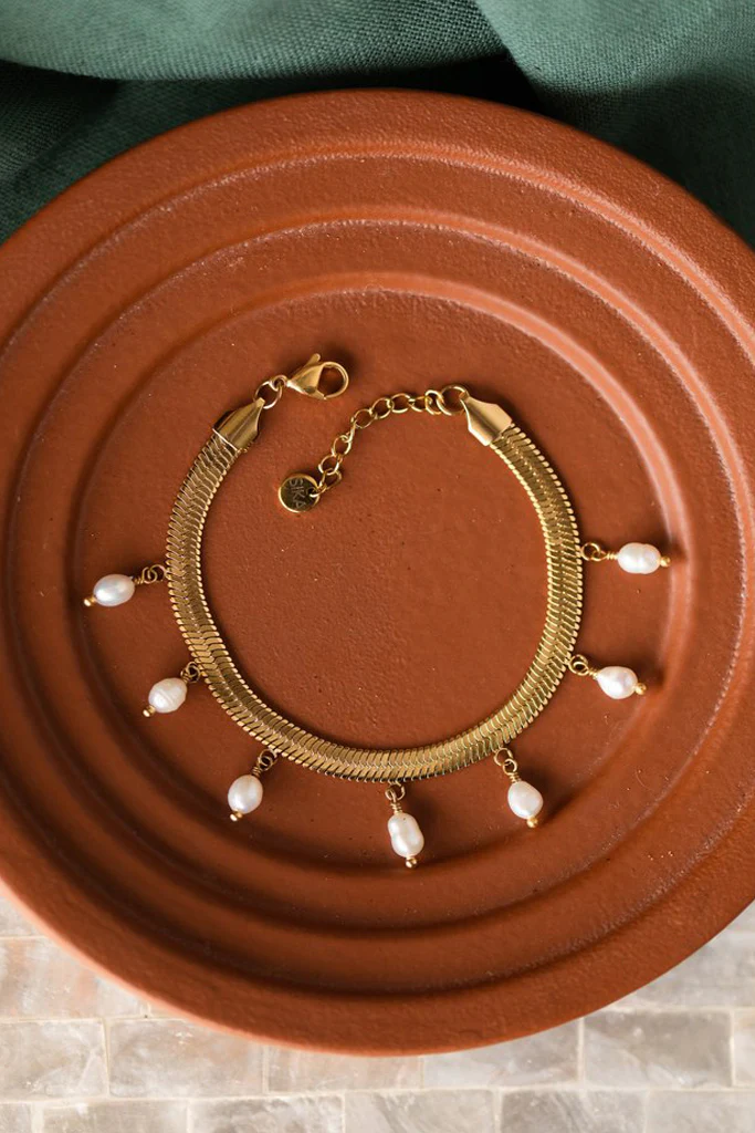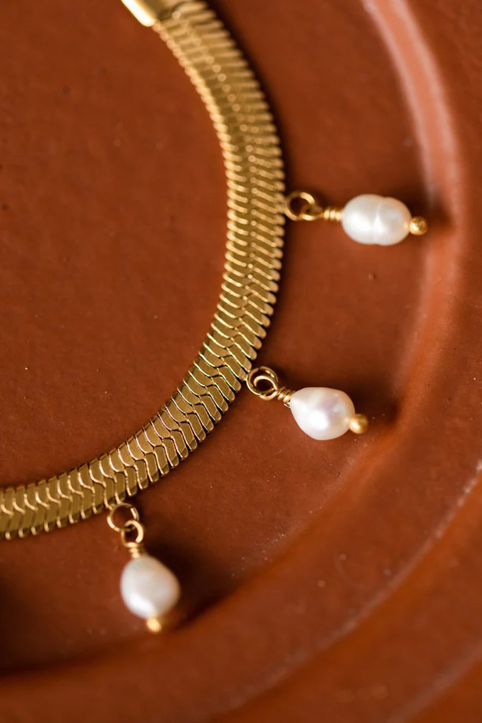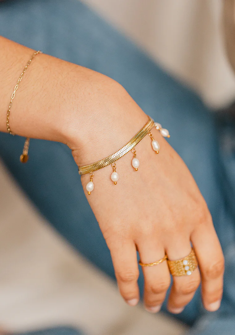 Le bracelet Lolita est fabriqué à la main dans mon atelier, Il est composé d’une maille serpentine plate décorée de pampilles en perles d’eau douce,