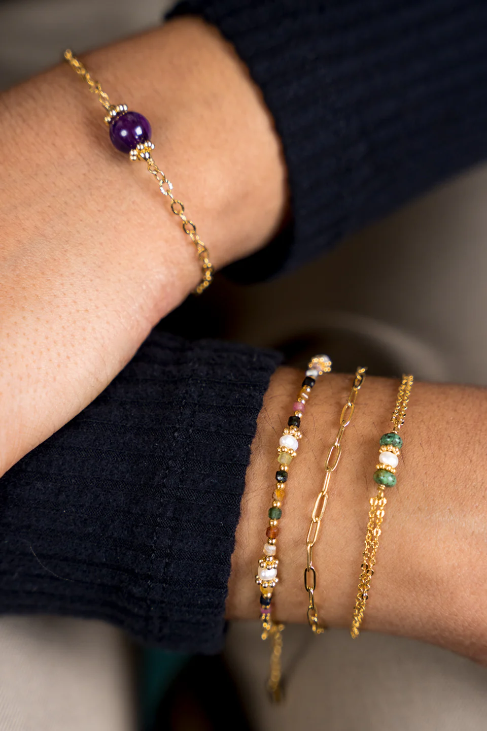 Le bracelet Thiziri est fabriqué à la main dans mon atelier, Il est composé de Tourmaline taillés en perles carrés, de perles d’eau douce rondes et d’une multitude de perles dorées,
