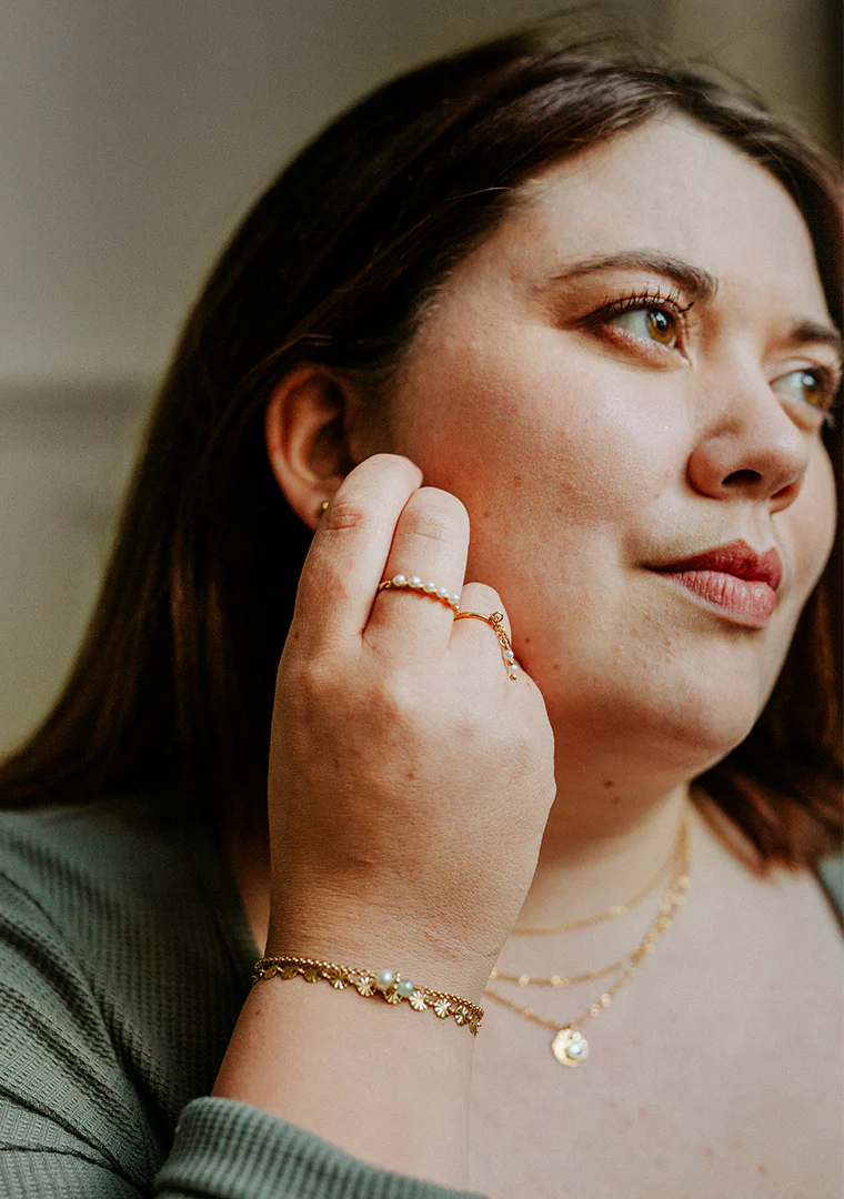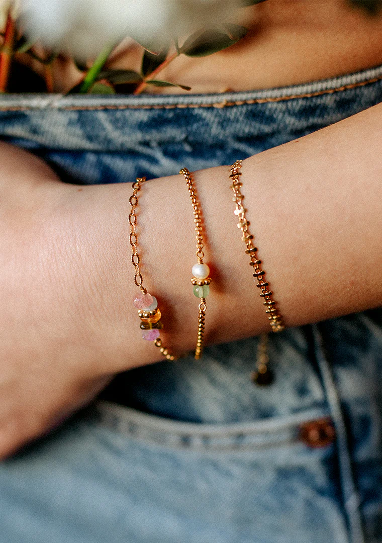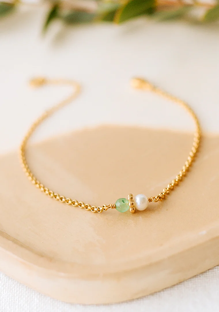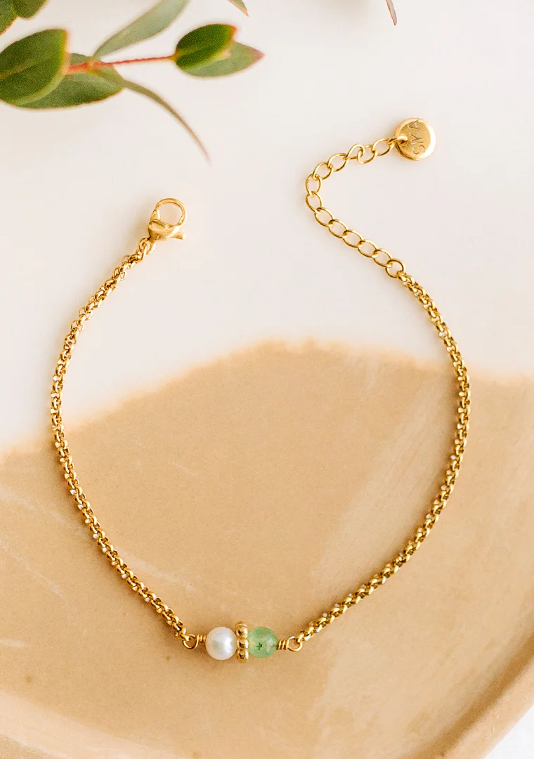 Le bracelet Tisha est fabriqué à la main dans mon atelier, Il est composé d’une chaine aux aux maillons ronds, d’une Perle d’eau douce et d’une Aventurine,