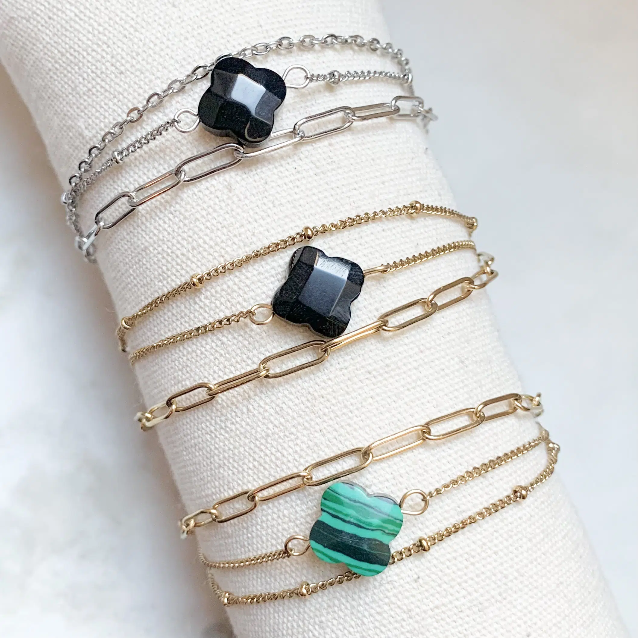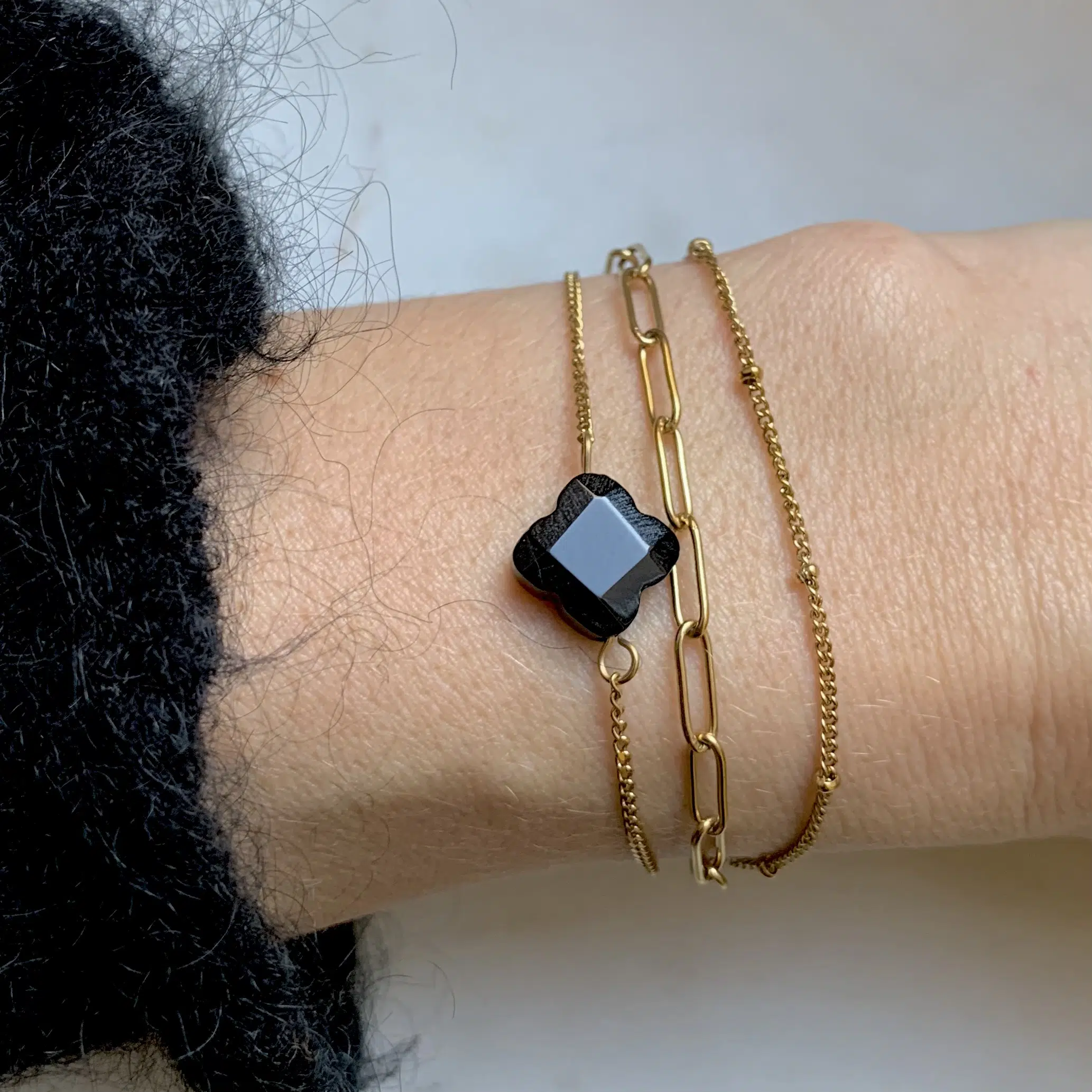 - Bracelet très fin composé de trois chaines (une très fine avec petites billes, une à gros maillon et la dernière avec un trèfle facetté en pierre naturelle)