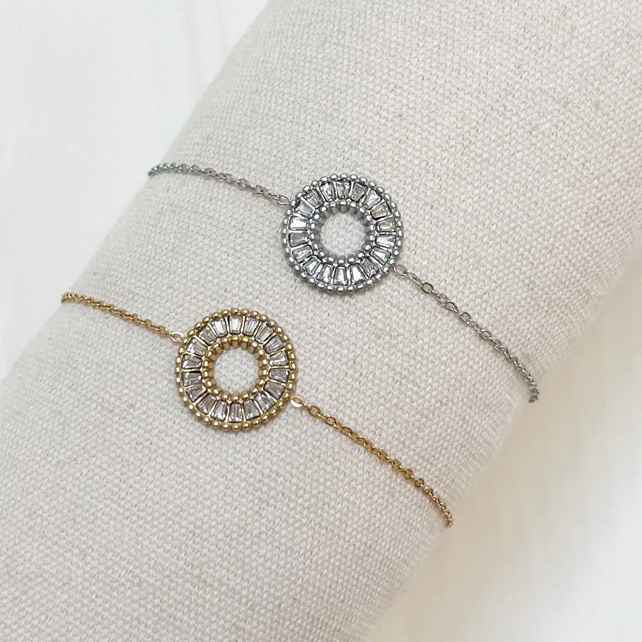 - Joli bracelet composé d’une très fine chaine et d’un centre rond serti de magnifiques petits strass prenant parfaitement la lumière.