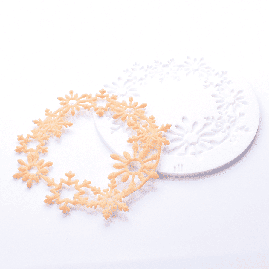 Le chablon Couronne de flocons « EXPERT » est spécialement conçu pour travailler les tuiles décoratives pour les desserts et les plats. Les formes sont travaillées avec un bord droit pour un rendu visuel très raffiné. Ce chablon Couronne de flocons requiert un niveau de maitrise élevé pour sa bonne réalisation. L’opération de démoulage requiert une certaine dextérité.