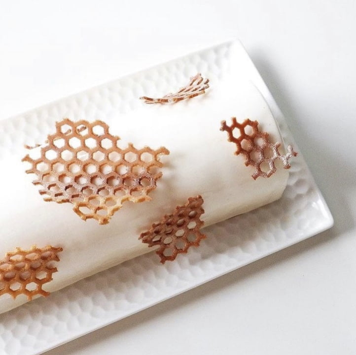 Le chablon plaque nid d’abeille permet également de réaliser des tuiles décoratives pour les desserts et les plats.